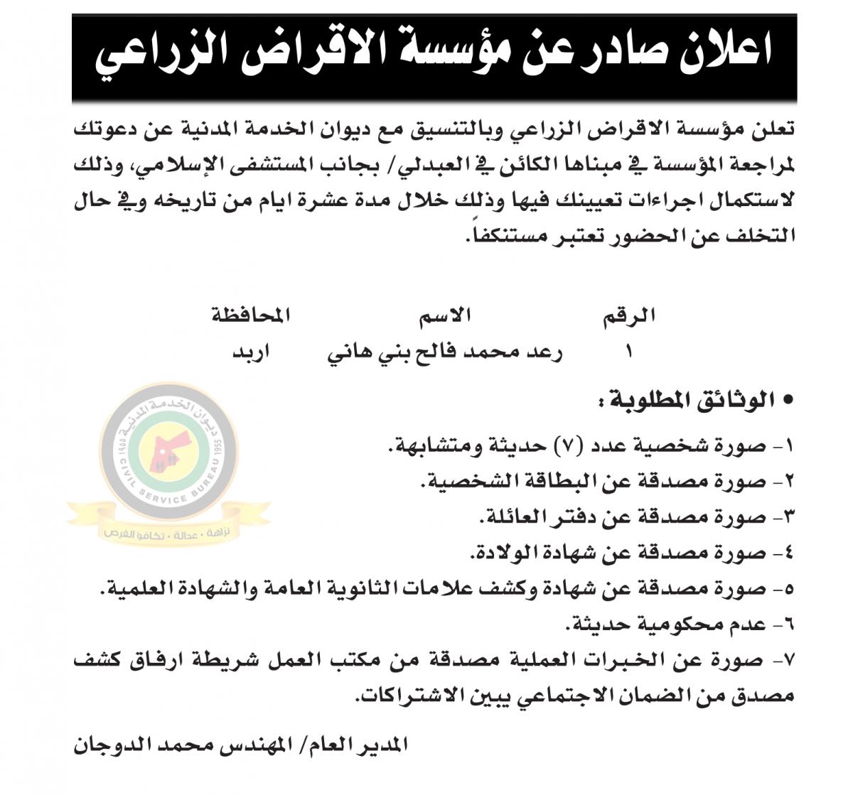 دعت مؤسسة الإقراض الزراعي وبالتنسيق مع ديوان الخدمة المدنية السيد رعد محمد فالح بني هاني لاستكمال إجراءات تعيينه . وتاليًا التفاصيل في الاعلان المرفق :