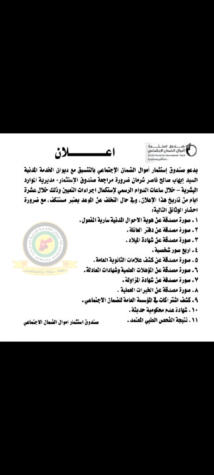 دعا صندوق استثمار أموال الضمان الاجتماعي بالتنسيق مع ديوان الخدمة المدنية مرشحا لاستكمال إجراءات تعيينه . وتاليًا التفاصيل في الاعلان المرفق :