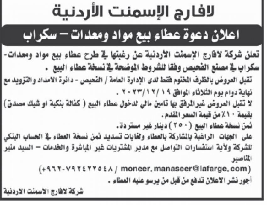 عطاء صادر عن شركة لافارج الاسمنت الاردنية