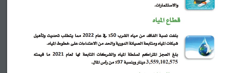 بين تقرير ديوان المحاسبة، أن نسبة الفاقد من مياه الشرب بلغت 50% في عام 2022 فيما بلغ العجز والتراكم لسلطة المياه والشركات التابعة لها لعام 2021 ما يقارب 4 مليون دينار وبنسبة 97% من رأس المال . وتاليًا التفاصيل: