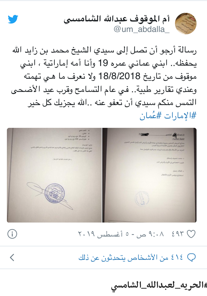 وكانت والدة الموقوف عبدالله قد طلبت في عام 2019 من الشيخ محمد بن زايد العفو عن ابنها.