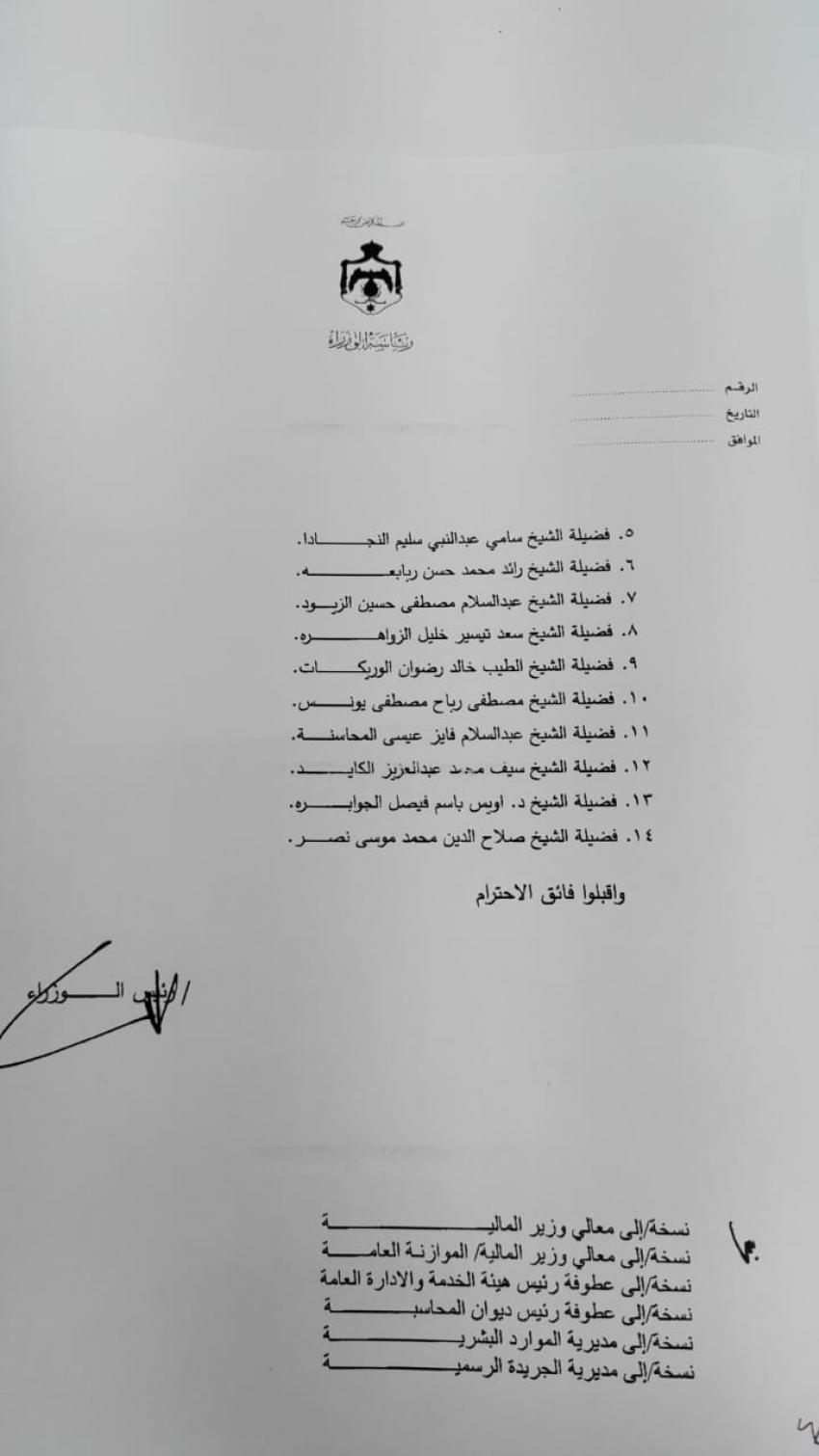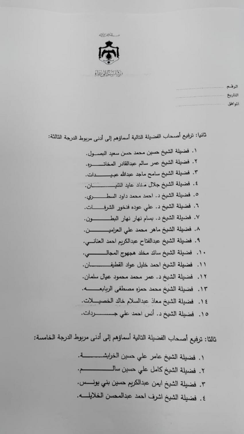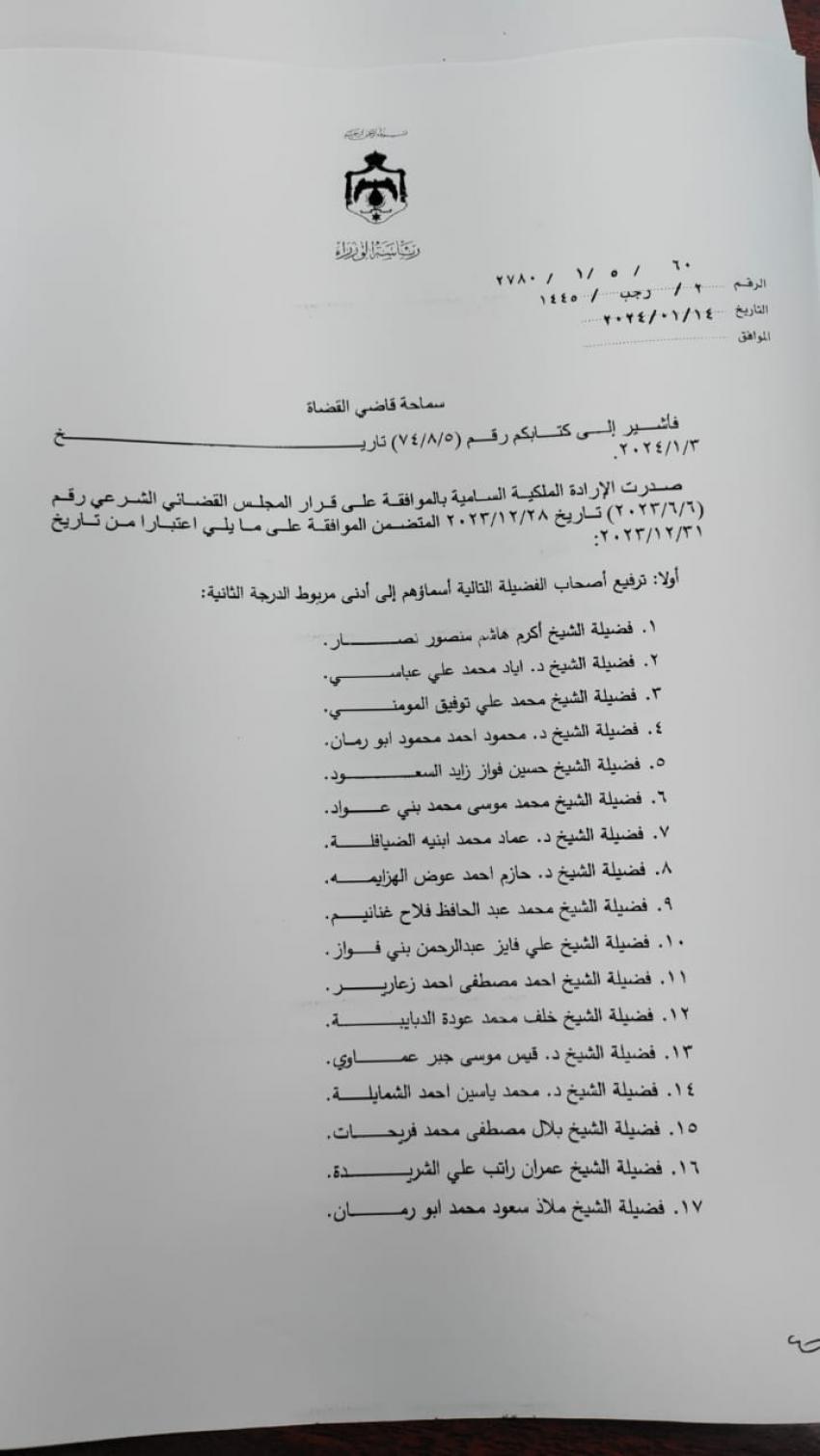 صدرت الإرادة الملكية السامية الاحد، بالموافقة على قرار المجلس القضائي الشرعي رقم 6 / 6 / 2023 تاريخ 28 / 12 / 2023 المتضمن ترفيع عدد من أصحاب الفضيلة إلى مختلف الدرجات من تاريخ 31 / 12 / 2023 .. وتاليا الأسماء :