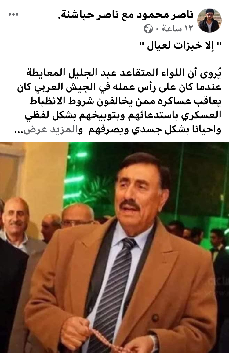 نشر الناشط السياسي ناصر محمود الحباشنة عبر صفحته الخاصة على الفيسبوك تحت عنوان ( إلا خبزات العيال ) حدثا انسانيا للباشا عبدالجليل المعايطة -لاقى تفاعلا كبير - اثناء خدمته العسكرية رابطا ذلك الحدث بالوضع المعيشي الراهن الذي يعاني منه المواطنين ، داعيا اصحاب القرار البائسين اليوم ليحذو حذو المعايطة في الحفاظ على خبز العيال حسب تعبيره حيث قال الحباشنة :