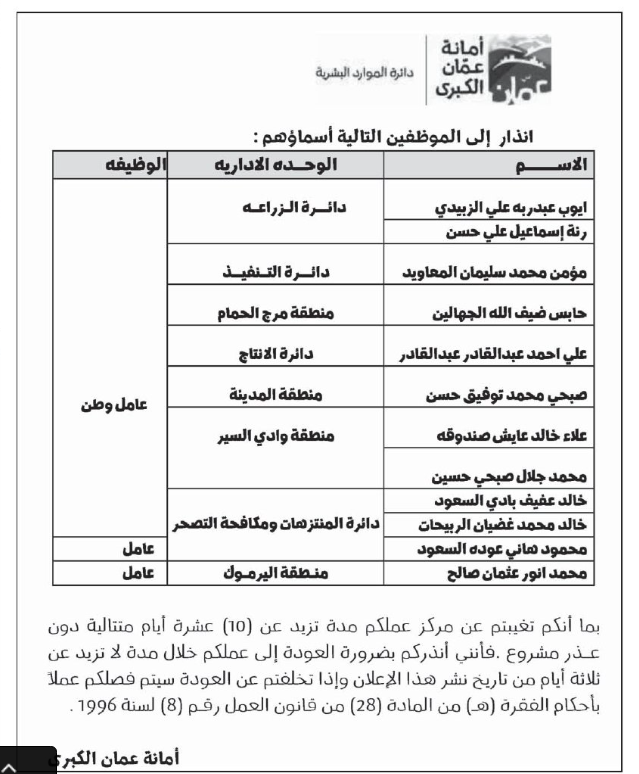 أنذرت أمانة عمّان الكبرى، موظفين، بالفصل من العمل في حال تخلفهم عن العودة لعملهم.وقالت الأمانة، في إعلان عبر الصحف اليومية للموظفين، "بما أنكم تغيبتم عن مركز عملكم مدة تزيد عن 10 أيام متتالية دون عذر مشروع. فأنني أنذركم بضرورة العودة إلى عملكم خلال مدة لا تزيد عن 3 أيام من تاريخ نشر هذا الإعلان وإذا تخلفتم عن العودة سيتم فصلكم".