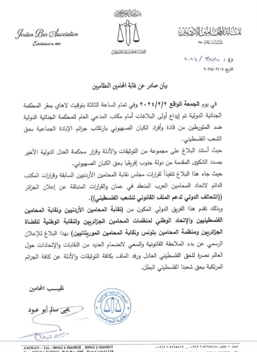 قالت نقابة المحامين الأردنيين خلال بيان صحفي اليوم إنها تقدمت ببلاغ لدى المحكمة الجنائية الدولية ضد قادة الكيان الصهيوني.