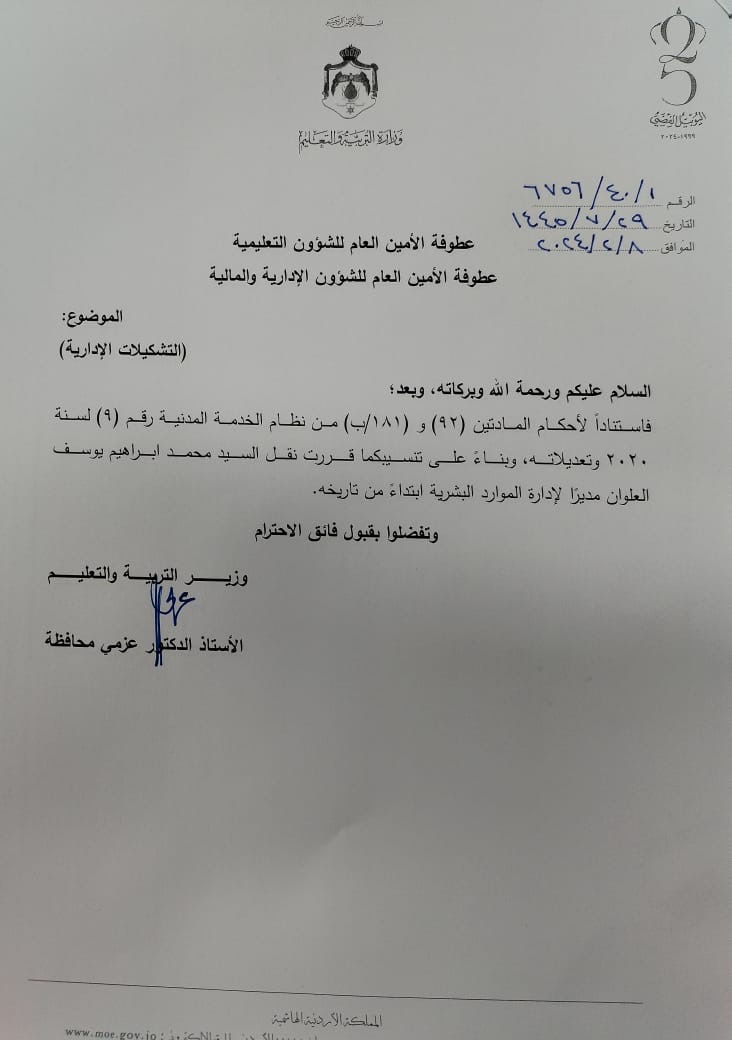 اسرة بلكي نيوز تهنئ السيد محمد إبراهيم العلوان بمناسبة قرار وزير التربية والتعليم والتعليم العالي والبحث العلمي الاستاذ الدكتور عزمي المحافظة بتعيينه مديرا لادارة الموارد البشرية بأم الوزارت …. وزارة التربية والتعليم .