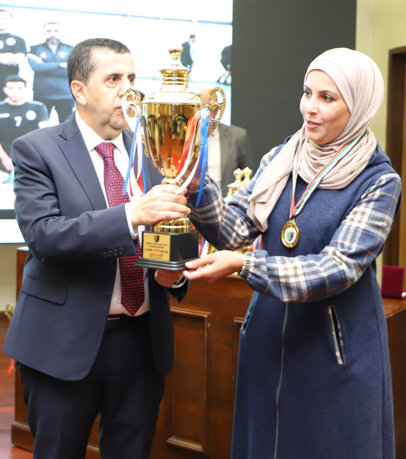 توج رئيس جامعة البلقاء التطبيقية الاستاذ الدكتور أحمد فخري العجلوني الفرق الفائزة في نهائيات البطولات الرياضية للاتحاد الرياضي للكليات الجامعية والجامعية المتوسطة في دورته العشرين بحضور الأساتذة نواب رئيس الجامعة وعميد شؤون الطلبة رئيس الاتحاد الرياضي للكليات الجامعية والجامعية المتوسطة الاستاذ الدكتور خالد الزعبي وعدد من عمداء الكليات ومدراء الوحدات والمراكز والدوائر وطلبة الجامعة. والقى عميد شؤون الطلبة الاستاذ الدكتور خالد الزعبي كلمة قال فيها ان ذكرى ميلاد قائد الوطن وملك القلوب هي ذكرى غالية على قلوبنا جميعا، نحتفل بها كل عام بإقامة بطولة القائد في عدد من متنوع من الألعاب الرياضي، مشيرا ان احتفال هذا العام جاء مع احتفالات المملكة باليوبيل الفضي لاستلام جلالة الملك عبدالله الثاني ابن الحسين المعظم سلطاته الدستورية، والذي يحكي قصة الإنجازات التي شيدها الاردنيون بقيادة جلالة الملك، لافتا ان جامعة البلقاء التطبيقية وبتوجيهات مباشرة من رئيسها الاستاذ الدكتور أحمد فخري العجلوني حرصت على دعم الرياضة والرياضيين المميزين والمتفوفين من طلبة الجامعة ممن تمكنوا من الحصول على البطولات وتحقيق الإنجازات على الصعيدين المحلي والدولي. وتضمن الحفل عرض فيديو عن مسيرة جلالة الملك المفدى منذ تسلمه سلطاته الدستورية في العام ١٩٩٩ بالإضافة إلى فيديو تعريفي عن مسيرة الاتحاد الرياضي للكليات الجامعية والجامعية المتوسطة. وفي ختام الحفل توج رئيس الجامعة الاستاذ الدكتور أحمد فخري العجلوني بحضور رئيس الاتحاد الرياضي للكليات الجامعية والجامعية المتوسطة الاستاذ الدكتور خالد الزعبي الفرق الفائزة في نهائيات بطولات الاتحاد الرياضي للكليات الجامعية والجامعية المتوسطة بالإضافة إلى تكريم منتخب الجامعة لكرة الطاولة للطالبات لحصوله على المركز الأول على مستوى الجامعات الاردنية، وتكريم المرحوم الدكتور منذر كريشان عميد كلية الزرقاء الجامعية الأسبق نائب رئيس الاتحاد. واسفرت نهائيات الاتحاد الرياضي للكليات الجامعية والجامعية المتوسطة بدورته العشرين على النحو التالي: حصل فريق كلية الهندسة التكنولوجية على المركز الأول في بطولة كرة السلة طالبات ٣*٣ فيما حل فريق كلية الاميرة رحمة الجامعية في المركز الثاني. كما حصل فريق مر كز الجامعة في بطولة كرة السلة ٣*٣ للطلاب فيما حصل فريق كلية الهندسة التكنولوجية على المركز الثاني.وحصل فريق كلية الخوارزمي في بطولة الكرة الشاطئية للطالبات على المركز الأول فيما حصل فريق كلية اربد الجامعية على المركز الثاني. كما حصل فريق كلية اربد الجامعية على المركز الأول في بطولة كرة الطائرة الشاطئية للطلاب فيما حل فريق مركز الجامعة بالمركز الثاني. وعلى صعيد الريشة الطائرة فردي طالبات حل فريق مركز الجامعة بالمركز الأول فيما حل فريق كلية الخوارزمي بالمركز الثاني. وحصل فريق مركز الجامعة على المركز الأول في بطولة الريشة الطائرة زوجي طالبات فيما حل فريق كلية الطفيلة بالمركز الثاني. وفي بطولة الريشة الطائرة فردي طلاب حصل فريق كلية لومنيوس على المركز الأول وحل فريق مركز الجامعة على المركز الثاني. وفي بطولة الريشة الطائرة زوجي طلاب حصل فريق كلية الطفيلة على المركز الأول فيما حصل فريق مركز الجامعة على المركز الثاني. وفي بطولة الطائرة طالبات حصل فريق كلية اربد الجامعية على المركز الأول فيما حصل فريق كلية الخوارزمي على المركز الثاني. كما حصل فريق كلية الكرك الجامعية على المركز الأول في بطولة الطاولة طلاب فيما حصل فريق كلية الطفيلة على المركز الثاني. وفي بطولة اليد حصل فريق مركز الجامعة على المركز الأول فيما حصل فريق كلية الهندسة التكنولوجية على المركز الثاني. كما تسلم جوائز كأس الاتحاد الشامل طالبات عميد شؤون الطلبة الاستاذ الدكتور خالد الزعبي، ووسام الاتحاد للمشرف الرياضي الكابتن إيناس ابو شقراء. وتسلم جوائز كأس الاتحاد الشامل طلاب نائب عميد كل