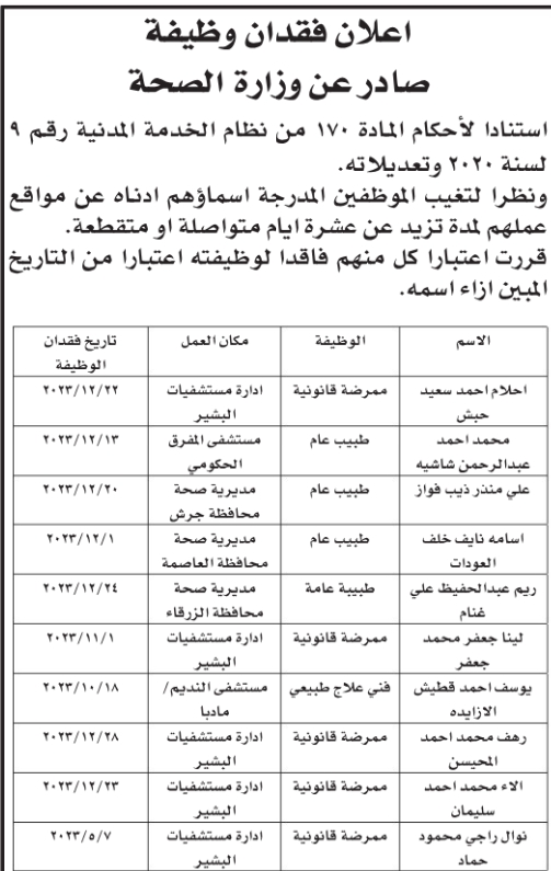 أعلنت وزارة الصحة، واستنادا لأحكام المادة 170 من نظام الخدمة المدنية، أن التالي أسماؤهم فاقدين لوظائفهم اعتباراً من التاريخ المبين إزاء اسم كل منهم.