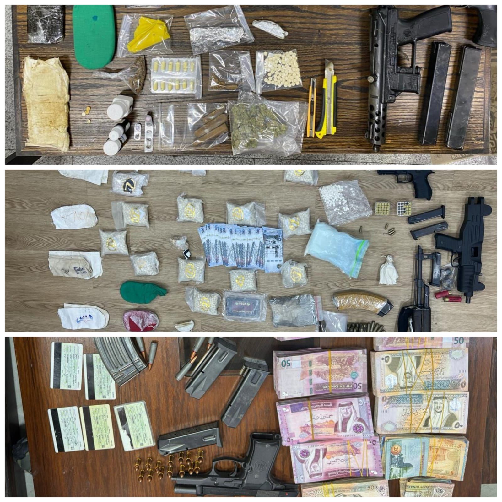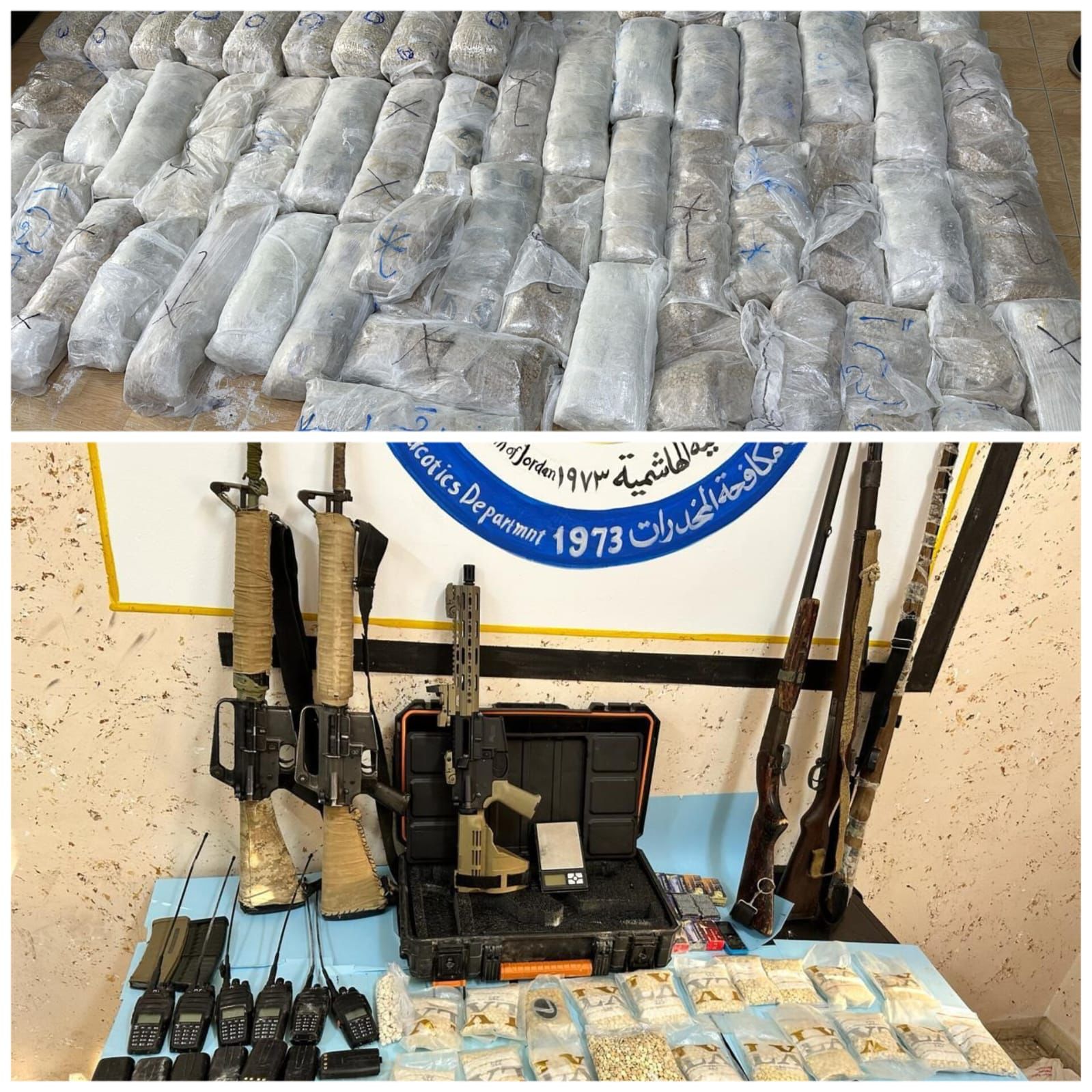 إدارة مكافحة المخدرات تحبط تهريب مليون ونصف حبة مخدرة لدولة مجاورة، وتحبط تهريب 2 كغم كريستال عبر حدود جابر، وتلقي القبض على ثلاثة مطلوبين خطرين خلال تعاملها مع 12 قضية نوعية خلال أيام* من بينها حملة أمنيّة في منطقة عنجرة في محافظة عجلون أُلقي القبض خلالها على 6 أشخاص بينهم مصنف خطر جداً قال الناطق الإعلامي باسم مديرية الأمن العام إنّ العاملين في إدارة مكافحة المخدرات تعاملوا خلال الأيام القليلة الماضية مع 12 قضية نوعية في مختلف مناطق المملكة ، إذ أُلقي القبض خلالها على 23 شخصاً من تجّار المخدرات ومروجيها ومهربيها.وأكّد الناطق الإعلامي أنّ أبرز تلك القضايا كانت إحباط محاولة تهريب مليون ونصف حبة مخدرة لإحدى دول الجوار داخل إحدى مركبات الشحن ، إذ كان فريق تحقيق خاص من الإدارة تولى متابعة المعلومات التي وردت حولها وتمكّن من تحديد مركبة الشحن التي أُخفيت داخلها الحبوب المخدرة وستة أشخاص تورّطوا بالقضية، إذ جرى بالتزامن ضبط مركبة الشخص ومداهمة أماكن وجود الأشخاص، وأُلقي القبض عليهم جميعاً وضُبطت مليون ونصف حبة مخدرة عُثر عليها بمخابئ سرية بجسد مركبة الشحن .وفي مركز حدود جابر أُحبطت محاولة أحد الأشخاص تهريب 2 كغم من مادة الكريستال المخدرة وأُلقي القبض عليه وما بحوزته من المواد المخدرة، وكما وأحبطت في مركز حدود جابر كذلك محاولة تهريب 70 ألف حبة مخدرة وأُلقي القبض على المتورط وما بحوزته من مواد مخدرة. وفي محافظة عجلون نُفّذت حملة أمنيّة في منطقة عنجرة على مطلوبين ومروجين وتجار للمخدرات، إذ أفضت لإلقاء القبض على ستة أشخاص من بينهم مصنف بالخطر وضُبطت بحوزتهم كميات من المواد المخدرة .وفي محافظة العاصمة تم التعامل مع أربع قضايا أُلقي القبض في الأولى على شخص مروج للمخدرات مصنف بالخطر جداً ينشط بترويج المخدرات في منطقة جبل التاج وضُبط بحوزته سلاح ناري ، فيما أُلقي كذلك القبض على مصنّف آخر بالخطر جنوب العاصمة بالقضية الثانية وضُبط بحوزته سلاح ناري وكمية من الحبوب المخدرة ، فيما تم في القضية الثالثة مداهمة شقة سكنية يستخدمها أحد تجّار المخدرات وأُلقي القبض عليه وشخص آخر برفقته وضُبط بحوزته 2500 حبة مخدرة و 4 كفوف حشيش وسلاح ناري ، وفي القضية الأخيرة دوهم منزل مروج للمخدرات وأُلقي القبض عليه وضُبط بحوزته 5 كفوف حشيش وسلاحان ناريان أوتوماتيكيان . وفي محافظة المفرق أُلقي القبض على تاجر للمخدرات بعد مداهمة منزله وضبط داخل المنزل بعد تفتيشه 17 الف حبة مخدرة و 5 كفوف حشيش ونصف كغم كريستال وثلاثة أسلحة نارية ، كما وأُلقي القبض في قضية أخرى في محافظة المفرق على تاجر للمخدرات وضُبط بحوزته 10 آلاف حبة مخدرة .وفي محافظة العقبة دوهم بركس استخدمه أحد الأشخاص لتخزين المواد المخدرة وأُلقي القبض على شخص داخله وبتفتيشه عثر على 25 ألف حبة مخدرة وخمسة أسلحة نارية ، كما والقي القبض في محافظة معان على مروج للمخدرات بحوزته 8 كفوف من مادة الحشيش.وجرت إحالة القضايا كافّة للمدعي العام لمحكمة أمن الدولة.