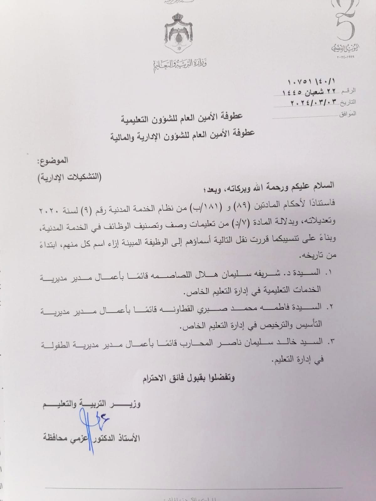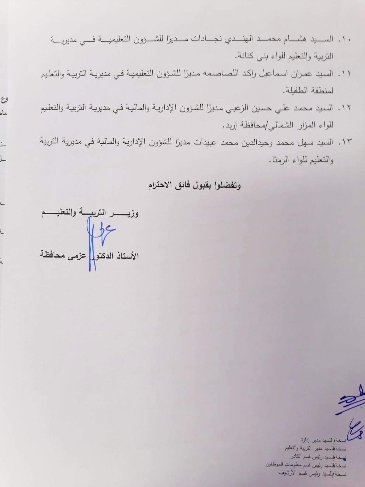 أجرى وزير التربية والتعليم الأستاذ الدكتور عزمي محافظة تشكيلات إدارية واسعة في الوزارة شملت مركز الوزارة والمديريات، ومدراء تربية ومدراء مختصين.