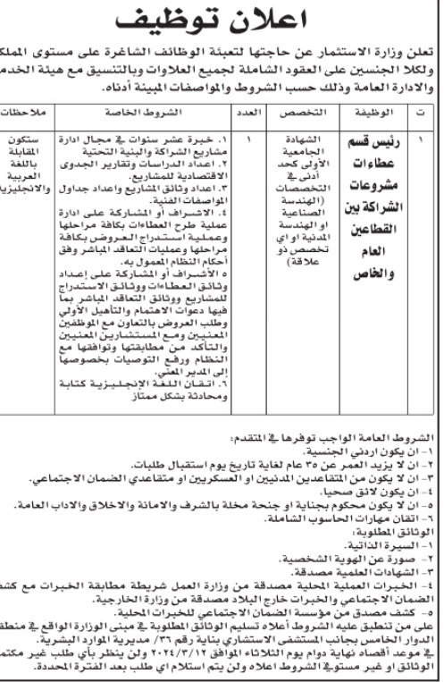 أعلنت وزارة الاستثمار عن حاجتها لتعبئة شاغر رئيس قسم عطاءات مشروعات الشراكة بين القطاعين العام والخاص.