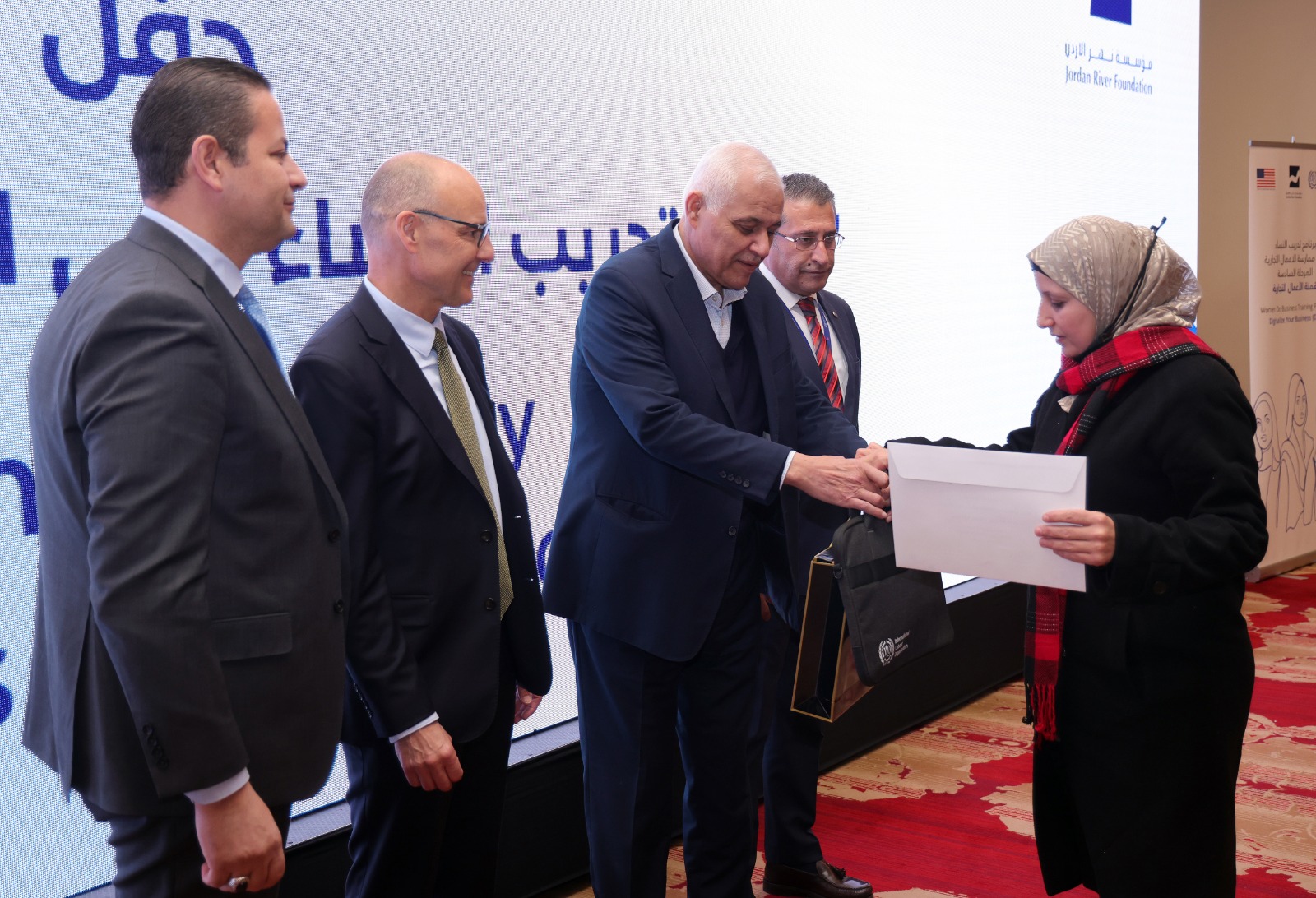 احتفلت منظمة العمل الدولية بالشراكة مع مؤسسة نهر الأردن، وممثلي جهات حكومية ومؤسسات المجتمع المدني، اليوم الأحد، بتخريج 156 مستفيدة من الأردنيات والسوريات من برنامج رقمنة المشاريع لرائدات الأعمال، برعاية أمين عام وزارة العمل فاروق الحديدي.ويأتي البرنامج المدعوم من مكتب السكان واللاجئين والهجرة التابع لوزارة الخارجية الأميركية، ضمن مشروع "إضفاء الطابع الرسمي للوصول إلى سوق العمل القانوني للاجئين والمجتمعات المستضيفة في الأردن"، ولزيادة المشاركة الاقتصادية للمرأة في الأردن من خلال دعم ريادة النساء الأردنيات والسوريات.وجاء تنفيذ المشروع على عدة مراحل، جرى فيها تطوير أدلة رقمنة المشاريع لتأسيس مشاريع أعمال ريادية للسيدات بشكل خاص، والذي اعتمد وطور من خلال منظمة العمل وتكييفه للبيئة الأردنية، إلى جانب تدريب نحو 422 سيدة على ريادة الأعمال.وقال منسق برامج دعم الاستجابة للأزمات في منظمة العمل الدولية قيس القطامين، إن هذه المبادرة تتعلق بتمكين النساء والشباب، وتزويدهم بالمهارات اللازمة للتغلب على التحديات في مشهد اقتصادي سريع ومتغير، مؤكدا أن ريادة الأعمال الرقمية قادرة على تغيير الواقع الاقتصادي للأفضل.وأشار مدير قسم التدريب والاستشارات والبرامج الدكتور محمد حوراني، إلى دور المشروع في تحقيق أهداف برنامج تمكين المجتمعات التابع لمؤسسة نهر الأردن، مشيرا إلى أن عدد المستفيدين من البرنامج خلال العامين الماضيين تجاوز 50 ألفا.ويهدف البرنامج المبتكر، إلى تدريب ودعم السيدات الأردنيات والسوريات على رقمنة مشاريعهن، وتمكينهن من توسيع نطاق أعمالهن، وتعزيز وصولهن إلى الأسواق المحلية، وتمكين الأفراد من تحقيق النجاح من خلال تطوير وتوسعة أعمالهم الخاصة.