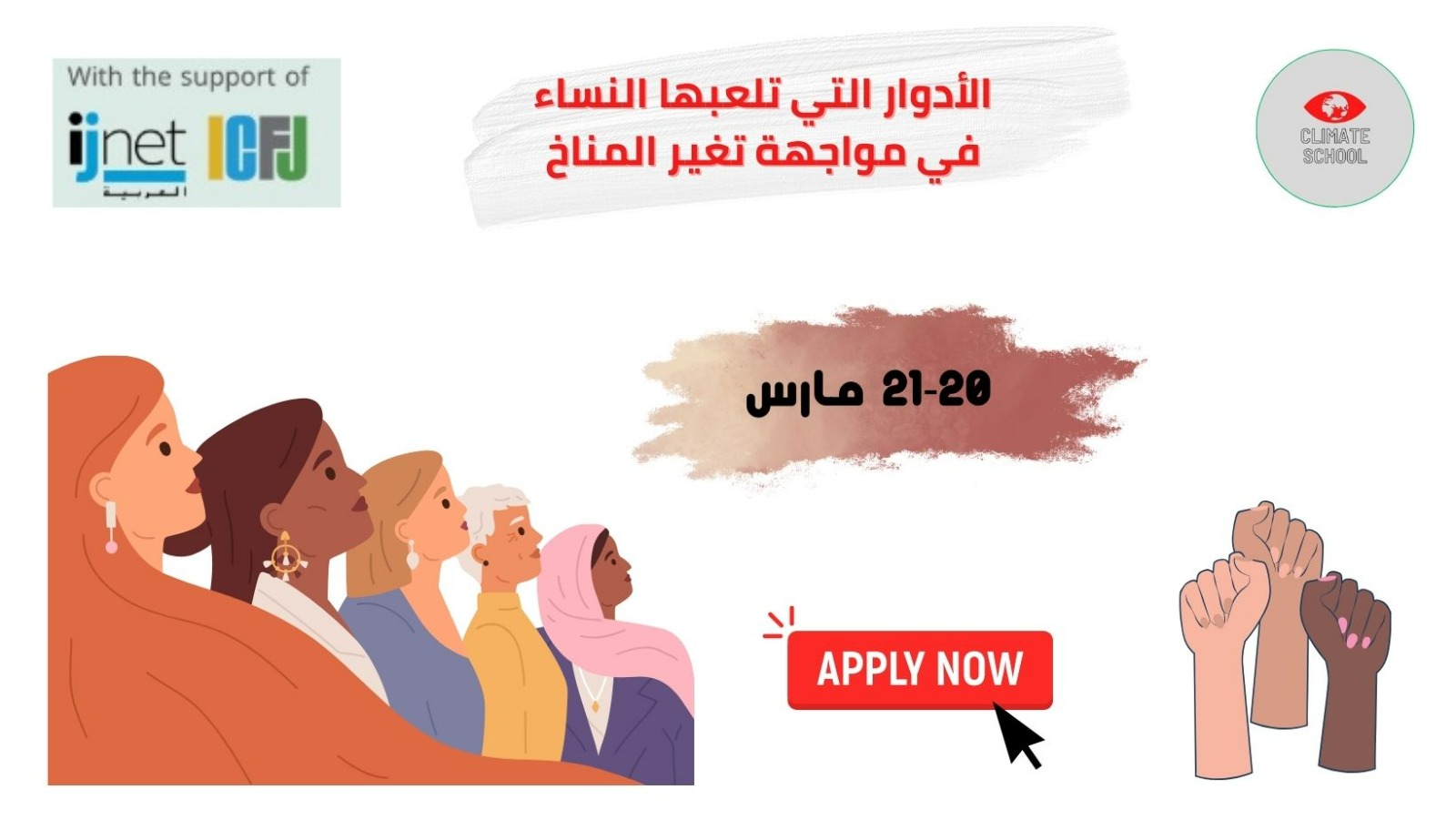 تنظم "مدرسة المناخ" تدريبا مكثفا على مدار يومي 20 و21 مارس 2024 بعنوان "الأدوار التي تلعبها النساء في مواجهة تغير المناخ"، وذلك بمنحة من برنامج مركز التوجيه المبادرات الإعلامية الناشئة في منطقة الشرق الأوسط وشمال أفريقيا، التابع لشبكة الصحفيين الدوليين.