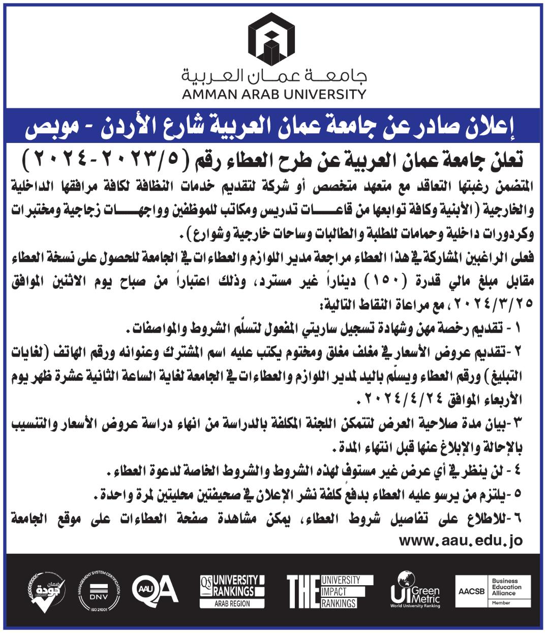 تعلن جامعة عمان العربية عن طرح عطاء رقم (5/2023-2024) المتضمن رغبتها في التعاقد مع متعهد متخصص أو شركة لتقديم خدمات النظافة لكافة مرافقها الداخلية والخارجية