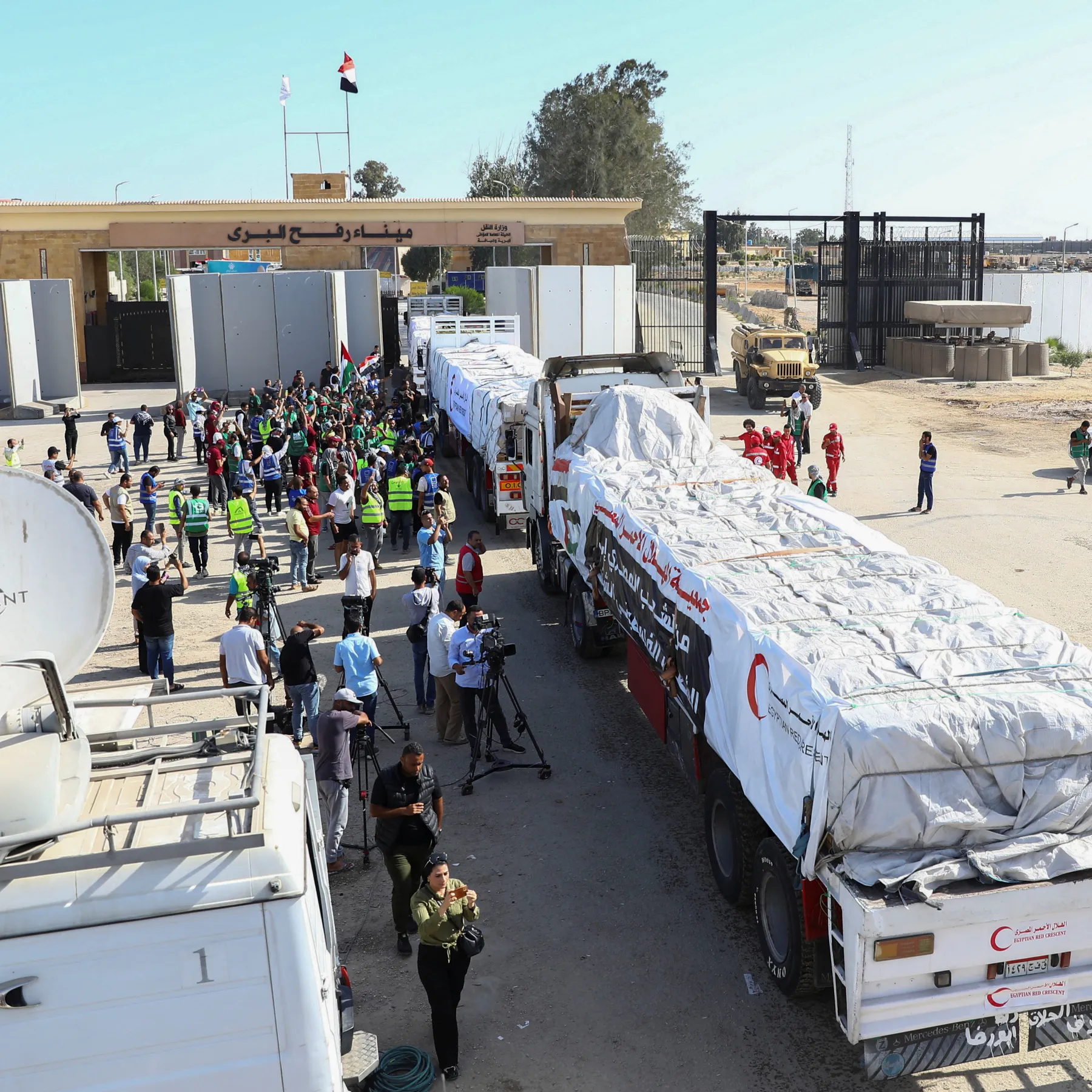 وستعبر ٥٠ شاحنة من خلال جسر الملك حسين و٥٠ أخرى من خلال المعبر الشمالي جسر الشيخ حسين تمهيداً لنقل المساعدات إلى قطاع غزة.