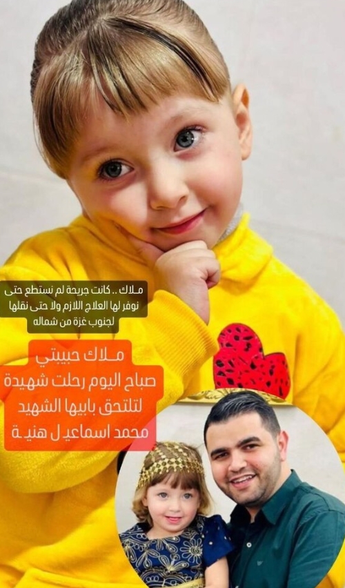 أفاد مراسل RT بأن الطفلة ملاك محمد هنية حفيدة رئيس المكتب السياسي لحركة "حماس" إسماعيل هنية، استشهدت اليوم الاثنين بعد أن أصيبت في القصف الاسرائيلي الذي أدى لاستشهاد والدها وأعمامها قبل أيام.وحسب المعلومات فإن ملاك هنية التي أصيبت في القصف الإسرائيلي أول أيام عيد الفطر، لم تتمكن عائلتها من تأمين العلاج لها ونقلها للخارج وقد استشهدت صباح اليوم متأثرة بجراحها.