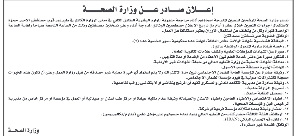 دعت وزارة الصحة بالتعاون مع ديوان الخدمة المدنية، العشرات من المرشحين والمرشحات؛ لاستكمال إجراءات التعيين.وبحسب الإعلان المنشور في الصحف اليومية، فإنه على المرشحين التواجد في مبنى الوزارة الكائن في طبربور، وكل من يتخلف عن استكمال الأوراق يعد مستنكفًا عن العمل.