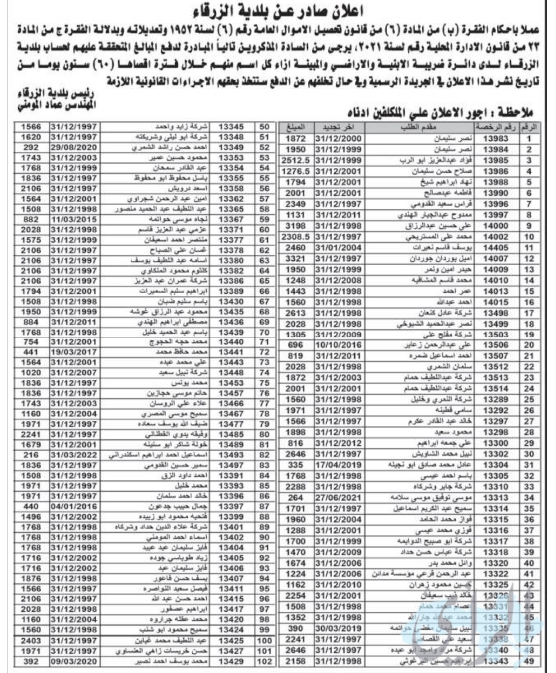 بالاسماء .. بلدية الزرقاء تطالب مواطنين بدفع أموال