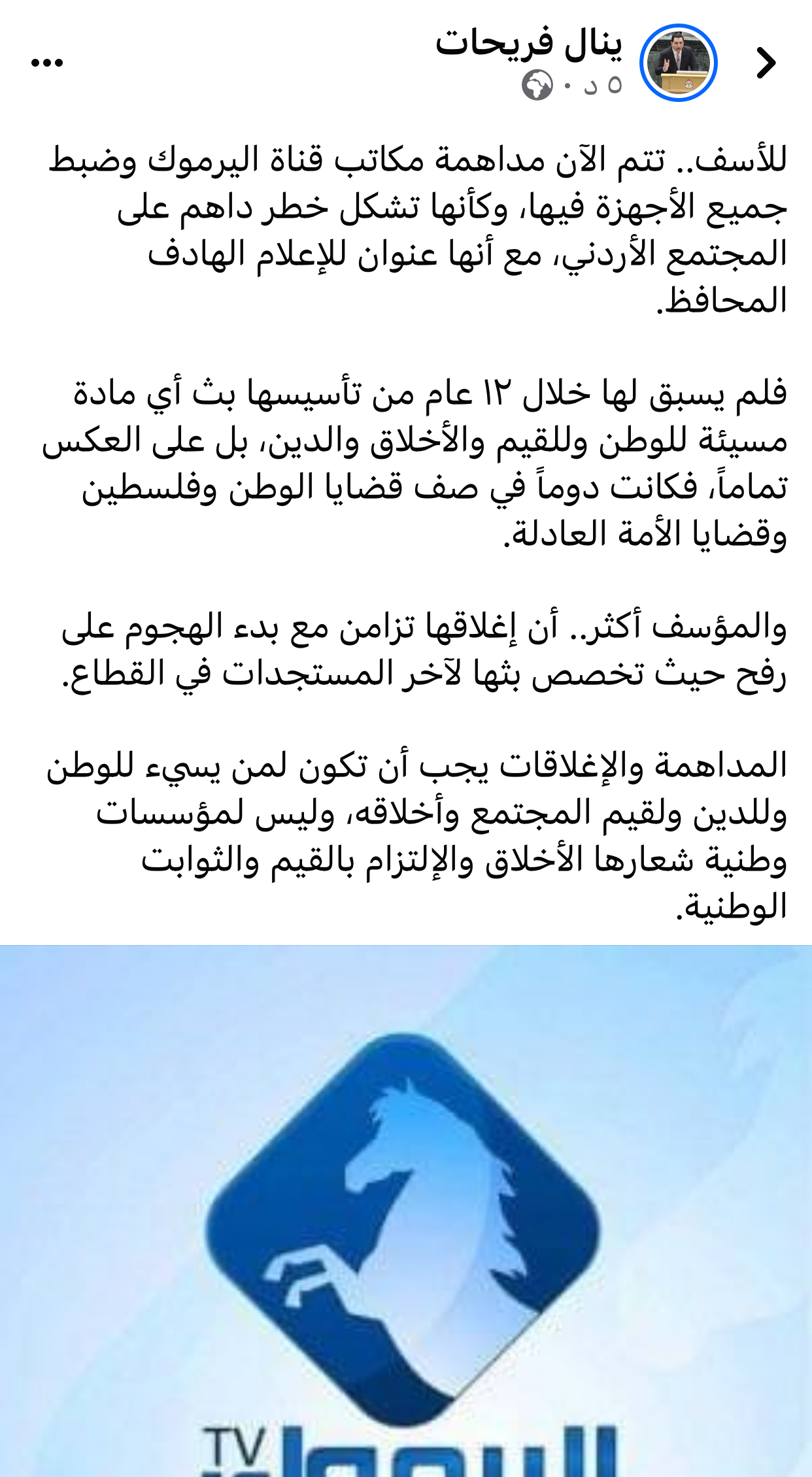 قال النائب ينال فريحات في ادراج عبر الفيسبوك :- للأسف.. تتم الآن مداهمة مكاتب قناة اليرموك وضبط جميع الأجهزة فيها، وكأنها تشكل خطر داهم على المجتمع الأردني، مع أنها عنوان للإعلام الهادف المحافظ.
