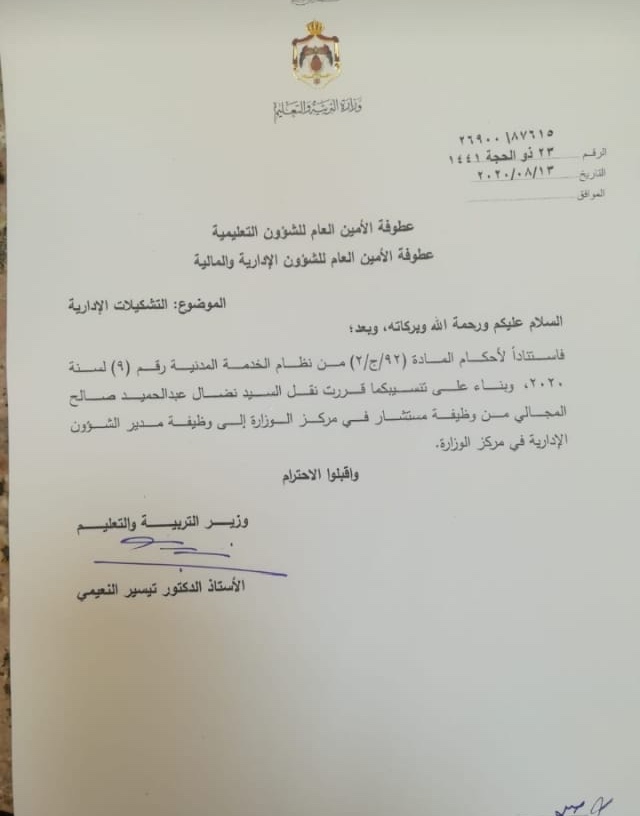 المجالي مديرا للشؤون الإدارية في وزارة التربية