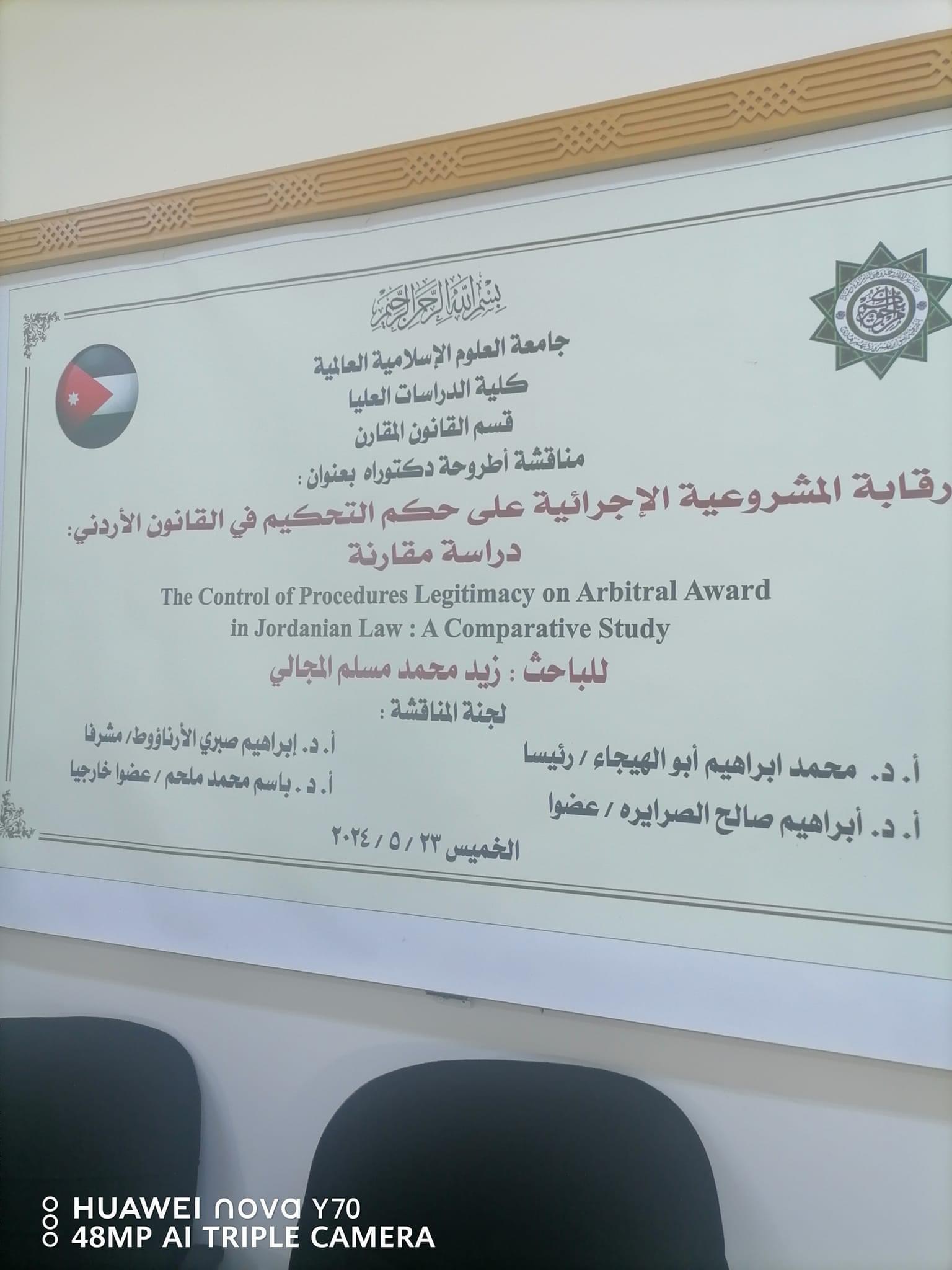 نوقشت في جامعة العلوم الإسلامية رسالة الدكتوراة الموسومة ب ( الرقابة المشروعية الإجرائية على حكم التحكيم في القانون الأردني ) للباحث زيد محمد مسلم المجالي وتشكلت لجنة المناقشة من الاستاذ الدكتور محمد ابو الهيجاء رئيسا وعضوية الاستاذ الدكتور إبراهيم الصرايرة والأستاذ الدكتور إبراهيم الأرناؤوط والأستاذ الدكتور باسم ملحم عضو خارجي .