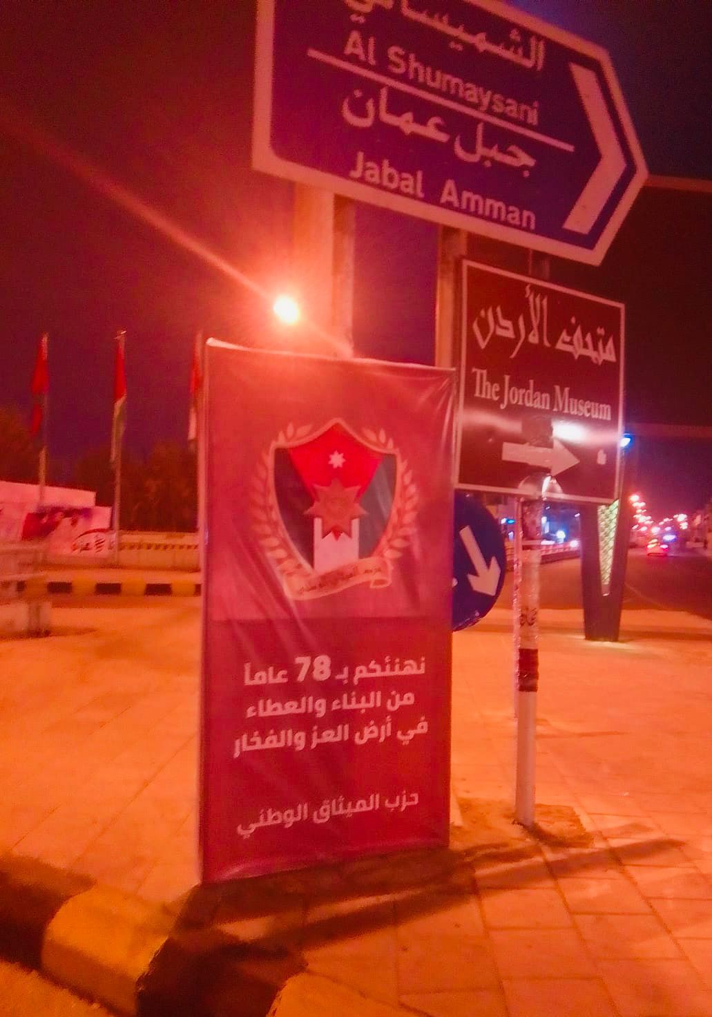 الميثاق الوطني ينشر اللافتات في المحافظات الاردنية تعبيرا عن فرحته بعيد الاستقلال الثامن والسبعين