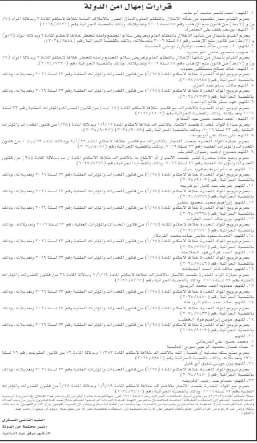 أمهلت محكمة أمن الدولة 32 متهمًا فترة 10 أيام، ابتداءً من الخميس، لتسليم أنفسهم إلى السلطات القضائية المختصة لمحاكمتهم عن التهم الموجهة إليهم، وإلا سيتم اعتبارهم فارين من وجه العدالة.ونشرت المحكمة، أسماء المتهمين، عملا بأحكام المادة 243 /2 من قانون أصول المحاكمات الجزائية رقم 9 لسنة 1961.وبينت أنَّه بانقضاء مدة الإمهال النافذة، وعدم تسليم أي منهم نفسه، سيعتبر المتهمون فارين من وجه العدالة وتوضع أموالهم تحت إدارة الحكومة، ويحرمون من التصرف بها طيلة فترة فرارهم، وسيتم منعهم من إقامة أيَّة دعاوى، وكل تصرف يقومون به أو التزام يتعهدون به باطل.وطلبت المحكمة من أفراد الأمن العام إلقاء القبض على كل واحد منهم وتسليمه إلى السلطات المختصة، داعية كل من يعلم بمحل وجودهم التبليغ عنهم.وتاليا الأسماء: