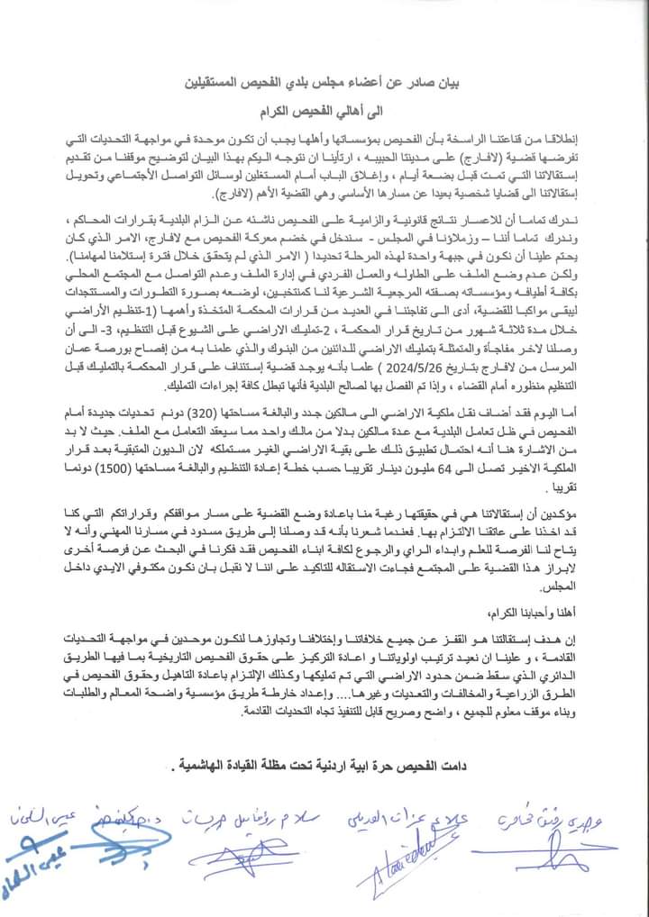 مؤكدين ان استقالاتنا هي في حقيقتها رغبة منا باعادة وضع القضية على مسار مواقفكم وقراراتكم التي كنا قد اخذنا على عاتقنا الالتزام بها. فعندما شعرنا بأنه قد وصلنا إلى طريق مسدود في مسارنا المهني وأنه لا يتاح لنا الفرصة للعلم وابداء الراي والرجوع لكافة ابناء الفحيص فقد فكرنا في البحث عن فرصة أخرى لابراز هذا القضية على المجتمع فجاءة الاستقاله للتاكيد على اننا لا نقبل بان نكون مكتوفي الايدي داخل المجلس.