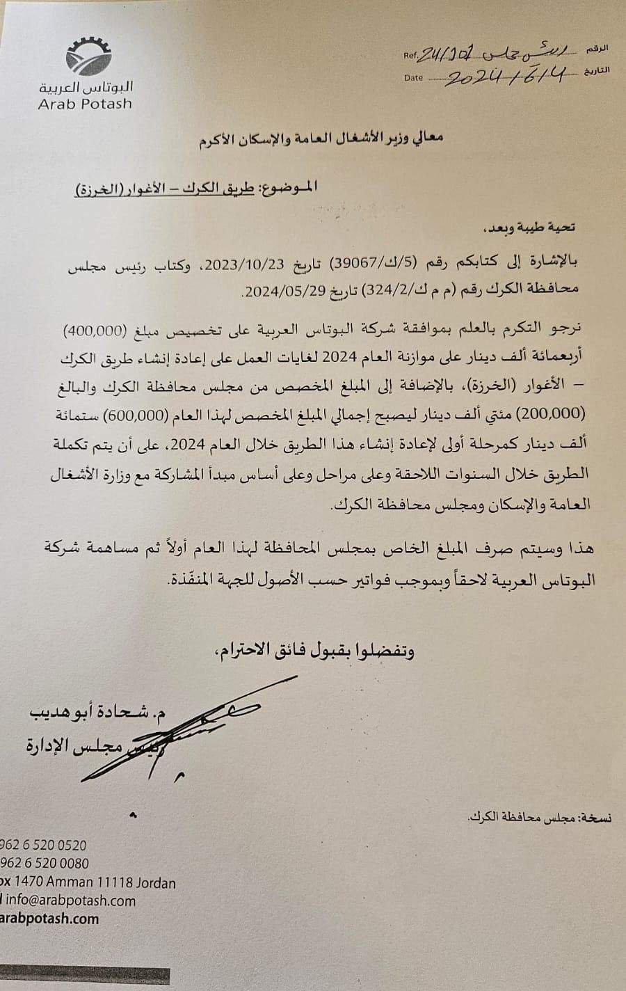 توافقت مطالب مجلس المحافظة لشركة البوتاس العربية لاعادة إنشاء طريق الكرك الاغوار (الخرزه) على مراحل ابتداءً من هذا العام ٢٠٢٤ وتم تخصيص مبلغ (600000) ستمائة الف دينار للبدء بهذا المشروع هذا العام حيث رصد مجلس المحافظة (200000) مئتان الف دينار ووافقت شركة البوتاس العربية Arab Potash Company ممثلة بمعالي شحادة ابو هديب بتخصيص (400000) اربعمائة الف دينار على أن يتم التنسيق والتشاركيه مع وزارة الاشغال العامة والاسكان لاستكمال الطريق في السنوات القادمة.