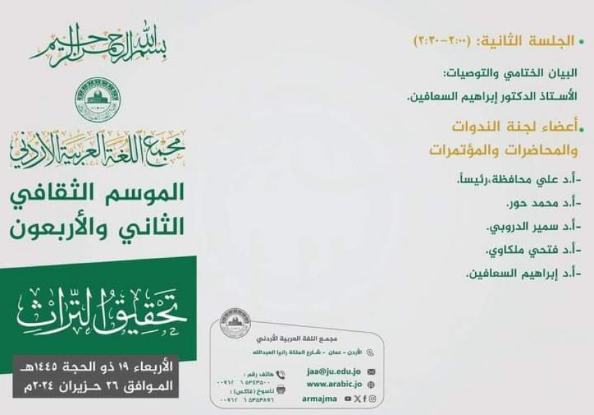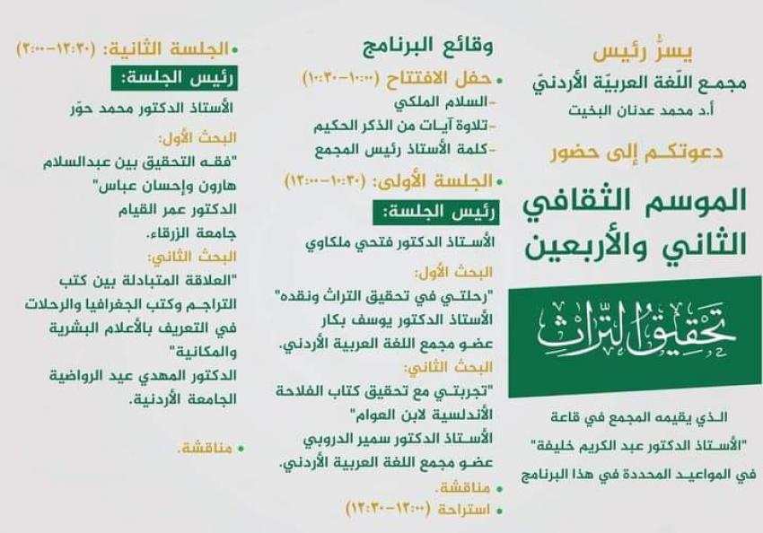 يقيم مجمع اللغة العربية الاردني الموسم الثقافي الثاني والاربعين بعنوان "تحقيق التراث".