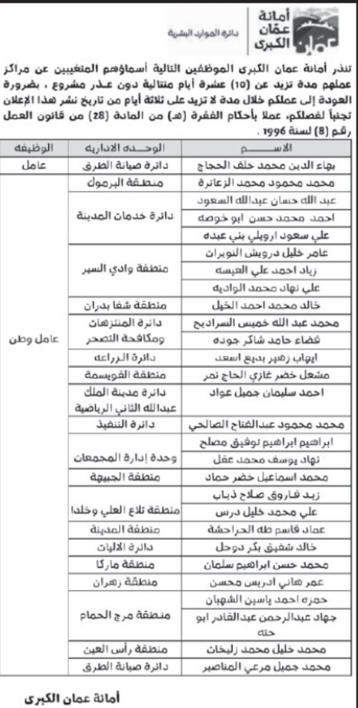 أنذرت أمانة عمّان الكبرى، 28 موظفا، بالفصل من العمل في حال تخلفهم عن العودة لعملهم.وقالت الأمانة، في إعلان عبر الصحف اليومية للموظفين، "بما أنكم تغيبتم عن مركز عملكم مدة تزيد عن 10 أيام متتالية دون عذر مشروع. فأنني أنذركم بضرورة العودة إلى عملكم خلال مدة لا تزيد عن 3 أيام من تاريخ نشر هذا الإعلان وإذا تخلفتم عن العودة سيتم فصلكم".
