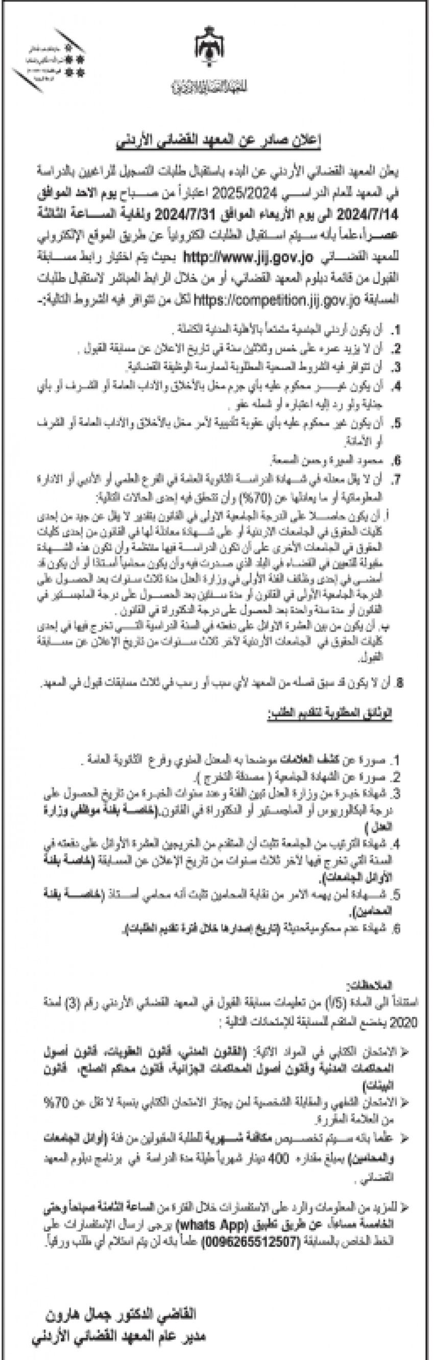 أعلن المعهد القضائي الأردني الأربعاء عن البدء باستقبال طلبات التسجيل للراغبين بالدراسة في المعهد للعام الدراسي 2024/2025 الكترونيا عبر الموقع الالكتروني للمعهد.