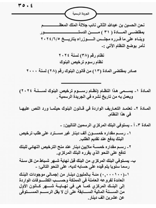 ووفقا للنظام فإن البنك المركزي يستوفي رسميين، الاول مقداره 50 ألف دينار غير مسترد على طلب ترخيص البنك .