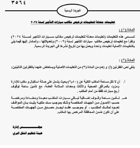 صدرت في الجريدة الرسمية الصادرة اليوم الثلاثاء، التعليمات المعدلة لتعليمات ترخيص مكاتب تاجير السيارات لسنة 2024.ونصت التعليمات على انه لا يجوز أن تقل مساحة المكتبات الكلية عن 40 م2.كما نصت التعليمات على تامين ساحة وقوف اضافية لباقي سيارات المكتب معبدة ومضاءة ومرخصة حسب الأصول.