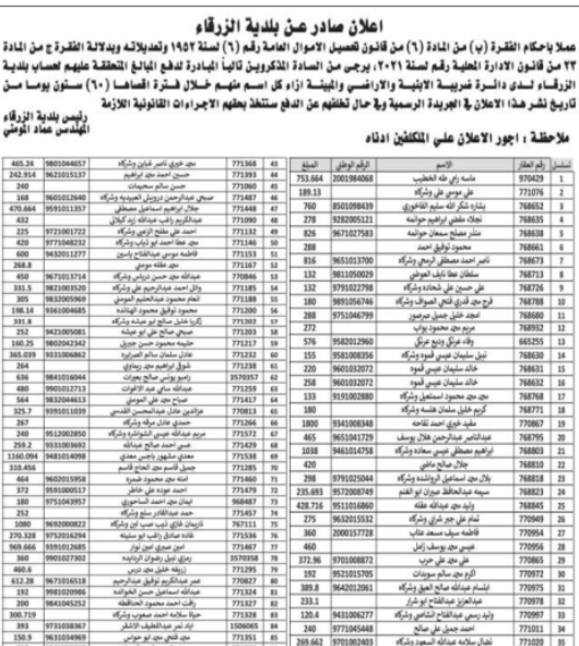 بلدية الزرقاء تنشر أسماء مواطنين ترتبت عليهم مبالغ مالية
