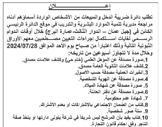 دعت دائرة ضريبة الدخل والمبيعات، اليوم الأربعاء، دفعة من المرشحين لاستكمال اجراءات التعيين.وتاليا التفاصيل: