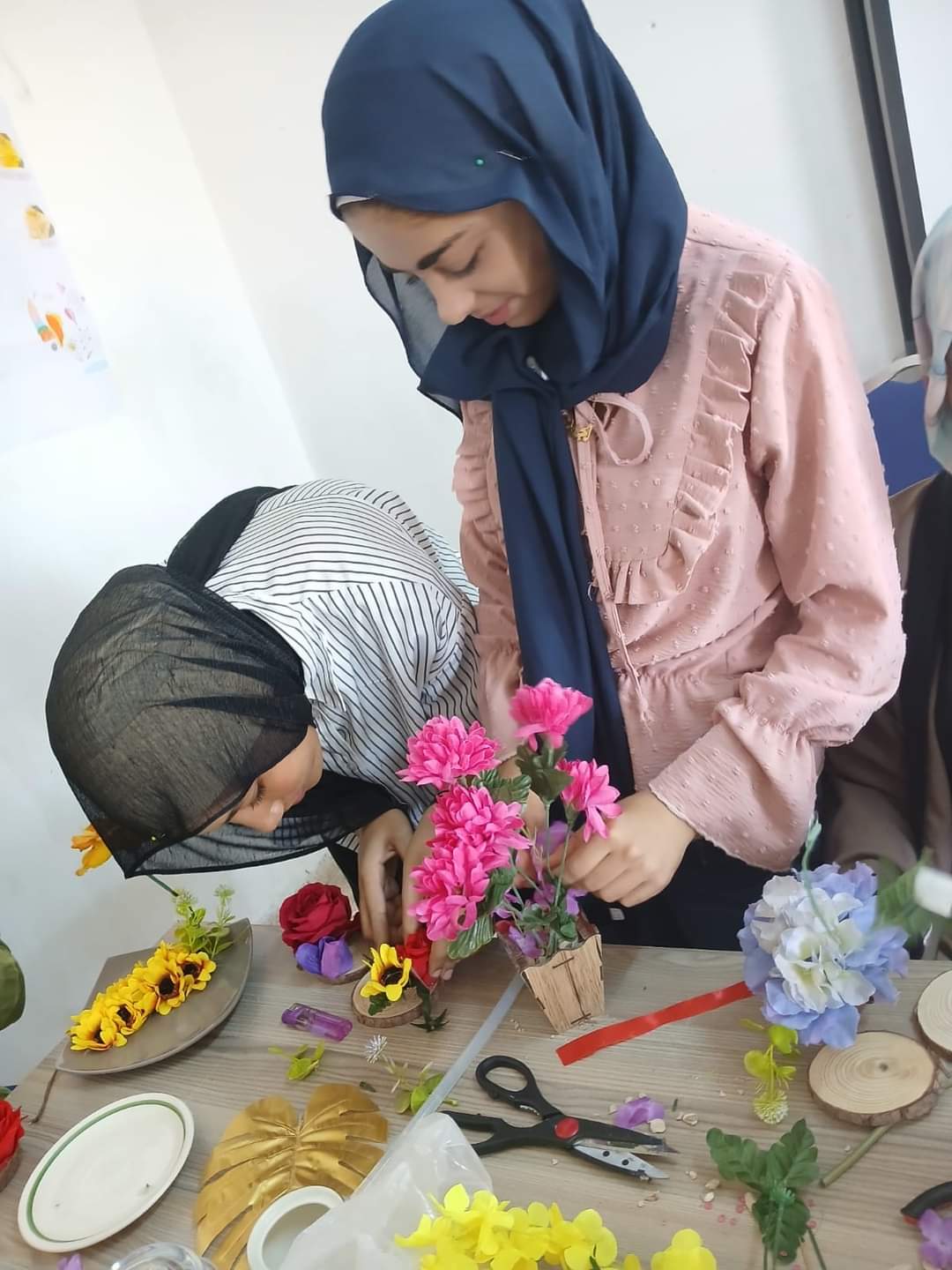 دربت خلالها هيا الزريقات المشاركات على كيفية إتقان المهارة وعمل باقات من الزهور باستخدام مواد بسيطة تضفي للمكان جمالية.