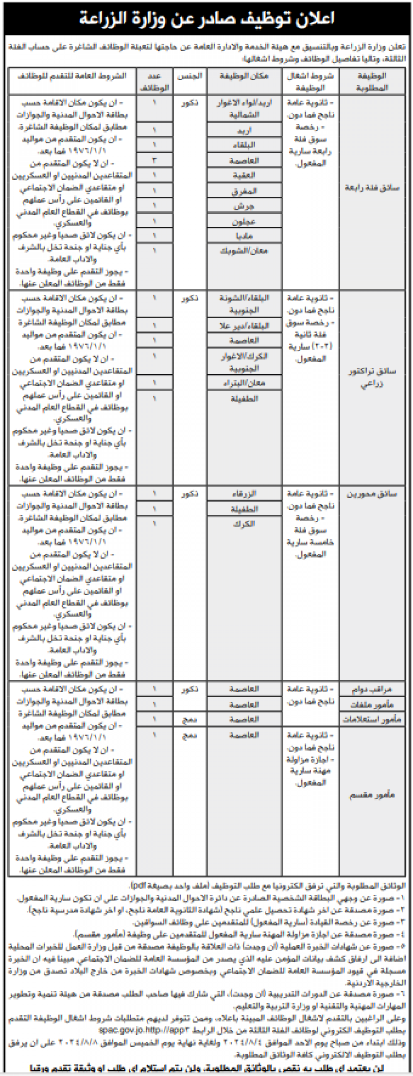 وزارة الزراعة وسلطة العقبة تعلنان عن توافر شواغر وظيفية