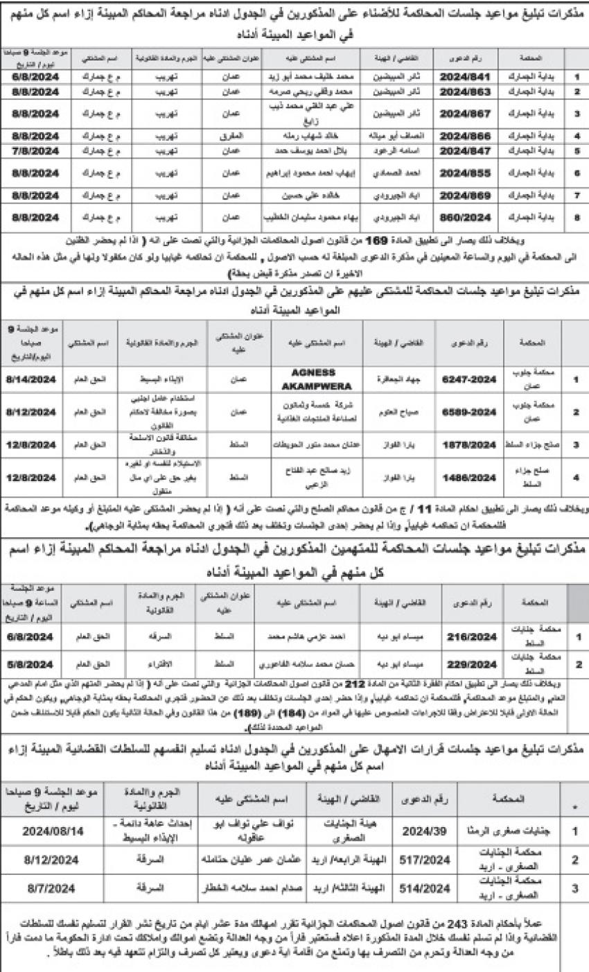 صدرت اليوم الاثنين مذكرات تبليغ مواعيد جلسات المحاكمة لمشتكى عليهم ولمتهمين ولأظناء وقرارات امهال.وطلبت المذكرات من المذكورين في الجداول أدناه مراجعة المحاكم المبينة ازاء اسم كل منهم في المواعيد المبينة أدناه.وتاليا الأسماء: