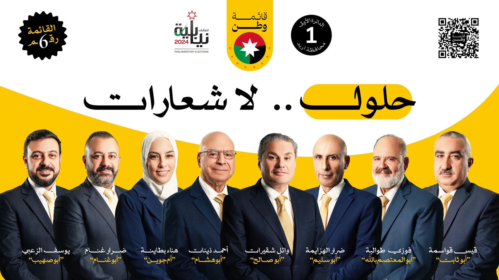 قائمة وطن في الدائرة الاولى في اربد ذات الطابع الكلاسيكي المحافظ البعيد عن الرقص على أوجاع الوطن ، تمثل المواطن الأردني بكل أصالته التي لم تفتتها كل موجات التغيير وتعبر عن فكر الأردنيين الأوفياء الذين لم يزحزح أيديهم عن القبض على حبه كل جمر التدليس والنفاق الذي غمر كل ما حولنا.