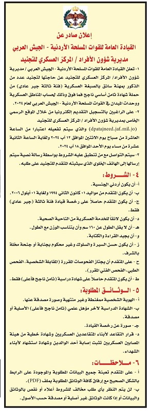 أعلنت القيادة العامة للقوات المسلحة الأردنية - الجيش العربي اليوم الأحد، عن حاجتها لتجنيد عدد من الذكور بمهنة سائق بالصبغة العسكرية (فئة ثالثة/ جير عادي) من حملة شهادة الثامن الأساسي فما فوق.