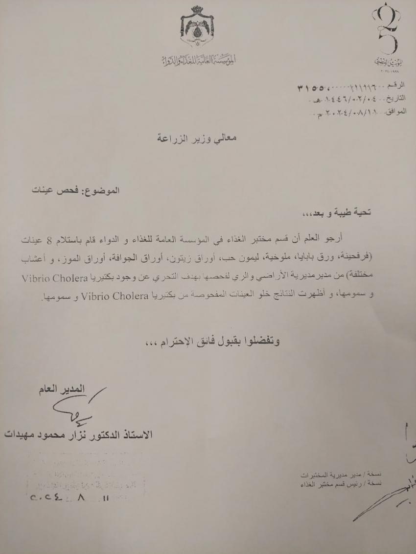 أصدرت وزارة الزراعة اليوم الأحد بيانا توضيحيا، حول ما تم تداوله عن منع الاحتلال الإسرائيلي مستورداته من الخضار الأردنية عبر المعبر الشمالي بإدعاء وجود بكتيريا الكوليرا الممرضة.