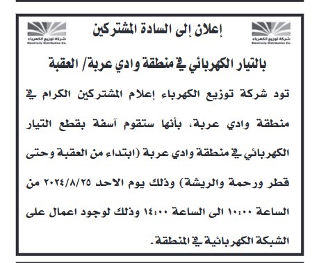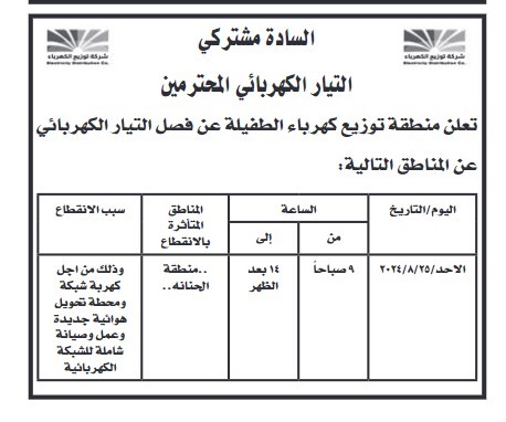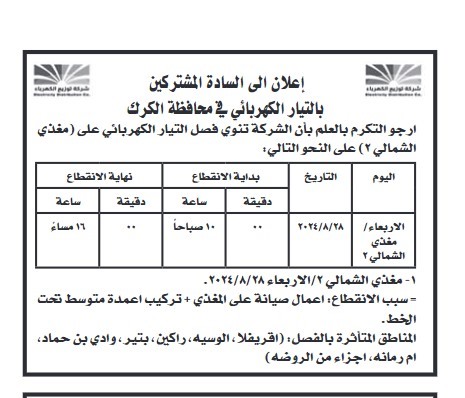 أعلنت شركات توزيع الكهرباء وكهرباء إربد عن فصل التيار الكهربائي عن مناطق واسعة في المملكة خلال الأسبوع المقبل.