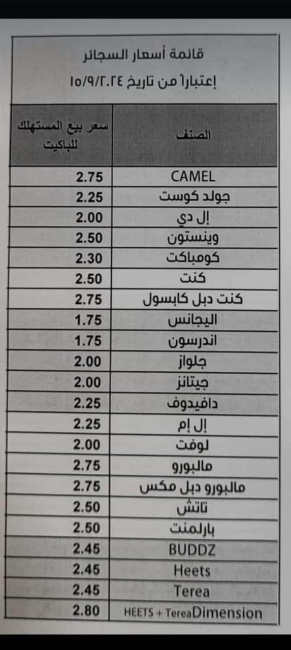 وأضاف في تصريح ، أنه لا يوجد لدى الضريبة أي معلومات حول زيادة أسعار الدخان بمقدار 25 قرشاً، مشيراً إلى أن السعر الأدنى لأي صنف دخان هو 170 قرشاً.تجدر الإشارة إلى أن بعض المواطنين قد اشتكوا من حالة الفوضى والاضطراب التي يشهدها سوق السجائر، حيث أفادت تقارير بزيادة قدرها 25 قرشاً على علبة السجائر الواحدة وفقاً لتسعيرة "مجهولة المصدر” قيل انه تم توزيعها على أصحاب محال بيع التبغ.تاليا تفاصيل القائمة المتداولة :