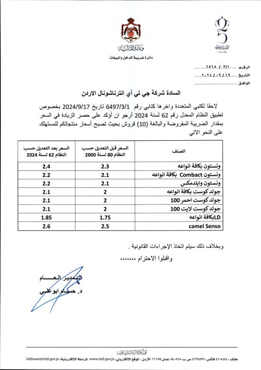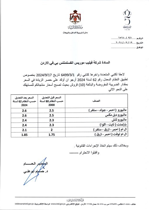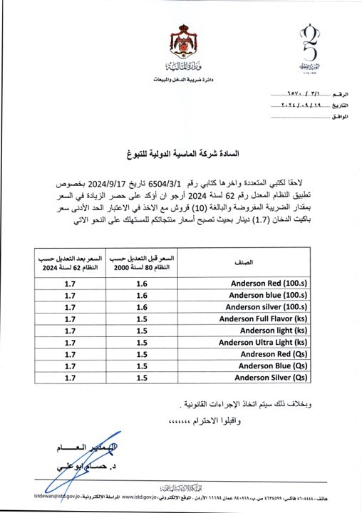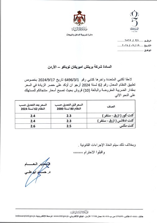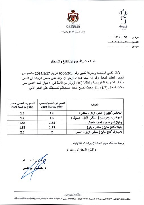 طلبت دائرة ضريبة الدخل والمبيعات من شركات السجائر في المملكة الالتزام بالأسعار المعلنة بعد قرار الحكومة رفع الضريبة على السجائر. أكد مدير عام دائرة ضريبة الدخل والمبيعات حسام أبو علي، ضبط عدد من موردي الدخان الذين رفعوا سعر باكيت الدخان العادي 25 قرشا بدلا من 10 قروش، حيث تمت مخالفتهم.