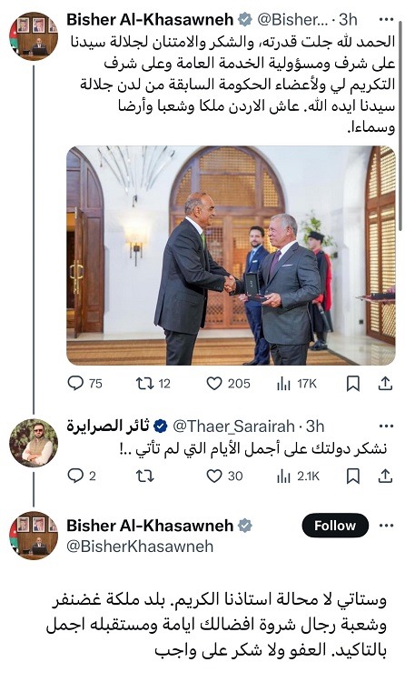 رد رئيس الوزراء السابق، بشر الخصاونة، عبر حسابه الرسمي في بمنصة (X)، على شخص وجه له تعليقا كتب فيه "نشكر دولتك على أجمل الأيام التي لم تأتي". وقال الخصاونة في رده، "وستاتي لا محالة استاذنا الكريم. بلد ملكة غضنفر وشعبة رجال شروة افضالك أيامه ومستقبله اجمل بالتأكيد. العفو ولا شكر على واجب".