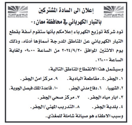 أعلنت شركتا كهرباء إربد وتوزيع الكهرباء عن نيتها فصل التيار الكهربائي عن عدد من المناطق خلال الأسبوع المقبل، وذلك لإجراء عمليات صيانة دورية على الشبكة الكهربائية بهدف تحسين الخدمة وضمان استمراريتها. وفيما يلي تفاصيل المناطق المتأثرة بعمليات فصل التيار الكهربائي والمواعيد المحددة للفصل: