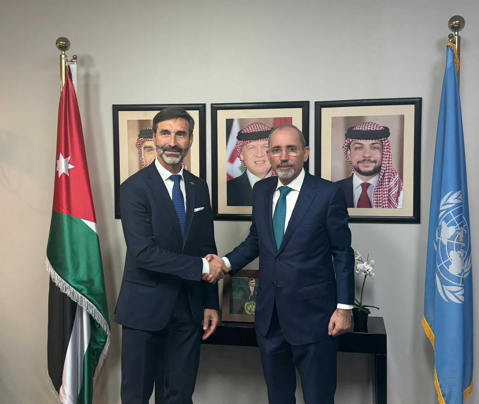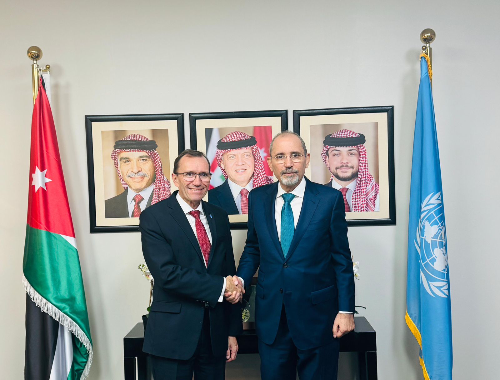 وأكد الوزيران ضرورة الاستمرار في بذل الجهود لإيجاد الأفق السياسي الحقيقي لتحقيق السلام العادل والدائم والشامل على أساس حل الدولتين، وإقامة الدولة الفلسطينية ذات السيادة على خطوط الرابع من حزيران عام ١٩٦٧ وعاصمتها القدس الشرقية، لتعيش بأمن وسلام إلى جانب إسرائيل. وبحث الصفدي وإيدي التحضيرات الجارية للاجتماع الوزاري الذي تنظمه اللجنة الوزارية العربية الإسلامية المكلفة بالتحرك الدولي لوقف الحرب على غزة إلى جانب النرويج والاتحاد الأوروبي، كما بحثا العلاقات الثنائية بين البلدين الصديقين وسبل تطويرها في مختلف المجالات. وثمن الصفدي الدور الهام الذي تقوم به النرويج في إطار رئاستها للجنة الاتصال المخصصة لتنسيق المساعدات الدولية المقدمة إلى الشعب الفلسطيني. وأجرى الصفدي مباحثات مع وزير خارجية سلوفاكيا يوراي بلانار تناولت الجهود المبذولة لوقف العدوان الإسرائيلي على قطاع غزة ولبنان، والتصعيد الخطير في الضفة الغربية المحتلة. وركزت المباحثات على العلاقات الثنائية بين البلدين الصديقين، وسبل تعزيزها في مختلف المجالات. كما التقى نائب رئيس الوزراء ووزير الخارجية وشؤون المغتربين نظيره وزير خارجية نيوزيلندا ونستون بيترز، في اجتماع بحث سبل تعزيز التعاون الثنائي بين البلدين في مختلف المجالات. وأكد الوزيران ضرورة إطلاق جهد دولي فاعل لوقف العدوان الإسرائيلي على قطاع غزة ولبنان، والتصعيد الخطير في الضفة الغربية المحتلة، كخطوة أولى وضرورية لخفض التصعيد في المنطقة وتجنبها تبعات كارثية. ووقع الصفدي وبيترز اتفاقية خدمات جوية بين البلدين الصديقين. إلى ذلك، عقد الوزير الصفدي ونائب رئيس مجلس الوزراء وزير الخارجية العراقي الدكتور فؤاد حسين، ووزير الخارجية والهجرة وشؤون المصريين بالخارج د. بدر عبد العاطي، اجتماعاً في سياق آلية التعاون الثلاثي بين الأردن والعراق ومصر على هامش أعمال الأسبوع رفيع المستوى للدورة التاسعة والسبعين للجمعية العامة للأمم المتحدة في نيويورك. وأكد الوزراء الحرص المشترك على تعزيز التعاون الثلاثي في كافة المجالات، وبما يخدم المصالح المشتركة، ويعزز العمل العربي المشترك، تنفيذاً لتوجيهات قادة البلدان الثلاثة الشقيقة. وصدر عن الاجتماع بيان مشترك تالياً نصه: اجتمع وزراء خارجية كل من المملكة الأردنية الهاشمية وجمهورية مصر العربية وجمهورية العراق بتاريخ ٢٤ أيلول ٢٠٢٤ على هامش أعمال الدورة ٧٩ للجمعية العامة للأمم المتحدة في نيويورك. وبحث الوزراء مسار العمل في إطار آلية التعاون الثلاثي، وذلك تحضيراً للقمة الثلاثية المرتقبة على مستوى القادة في القاهرة. وتناول الوزراء التصعيد الخطير الجاري في المنطقة، وشددوا على أن وقف هذا التصعيد يبدأ بوقف العدوان الإسرائيلي على غزة. كما أدان الوزراء العدوان الإسرائيلي على لبنان، وأكدوا أن اسرائيل تدفع المنطقة إلى حرب شاملة. ودعا الوزراء المجتمع الدولي ومجلس الأمن إلى تحمل مسؤولياتهم ذات الصلة لوقف الحرب، وأشاروا إلى أن إسرائيل تتحمل المسؤولية الكاملة عن هذا التدهور الذي سيكون له تبعات خطيرة على المنطقة برمتها.