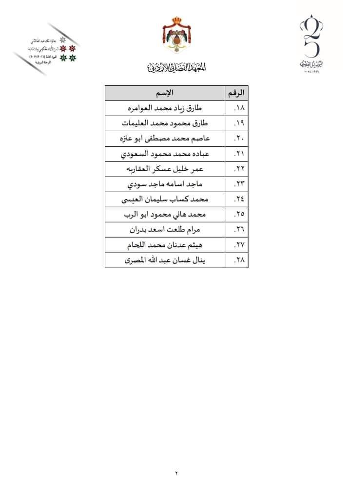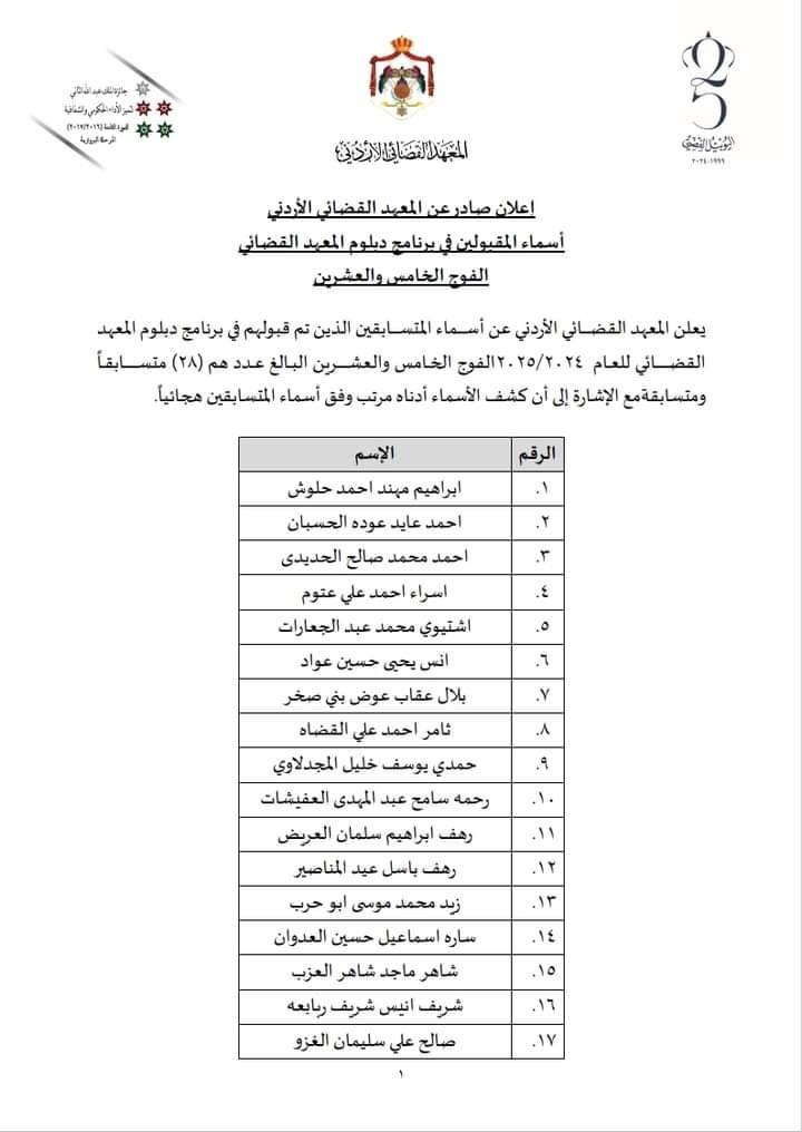 أعلن المعهد القضائي الأردني عن أسماء المتسابقين الذين تم قبولهم في برنامج دبلوم المعهد القضائي للعام 2024/2025الفوج الخامس والعشرين البالغ عدد هم (28) متسابقاً ومتسابقة مع الإشارة إلى أن كشف الأسماء أدناه مرتب وفق أسماء المتسابقين هجائياً.