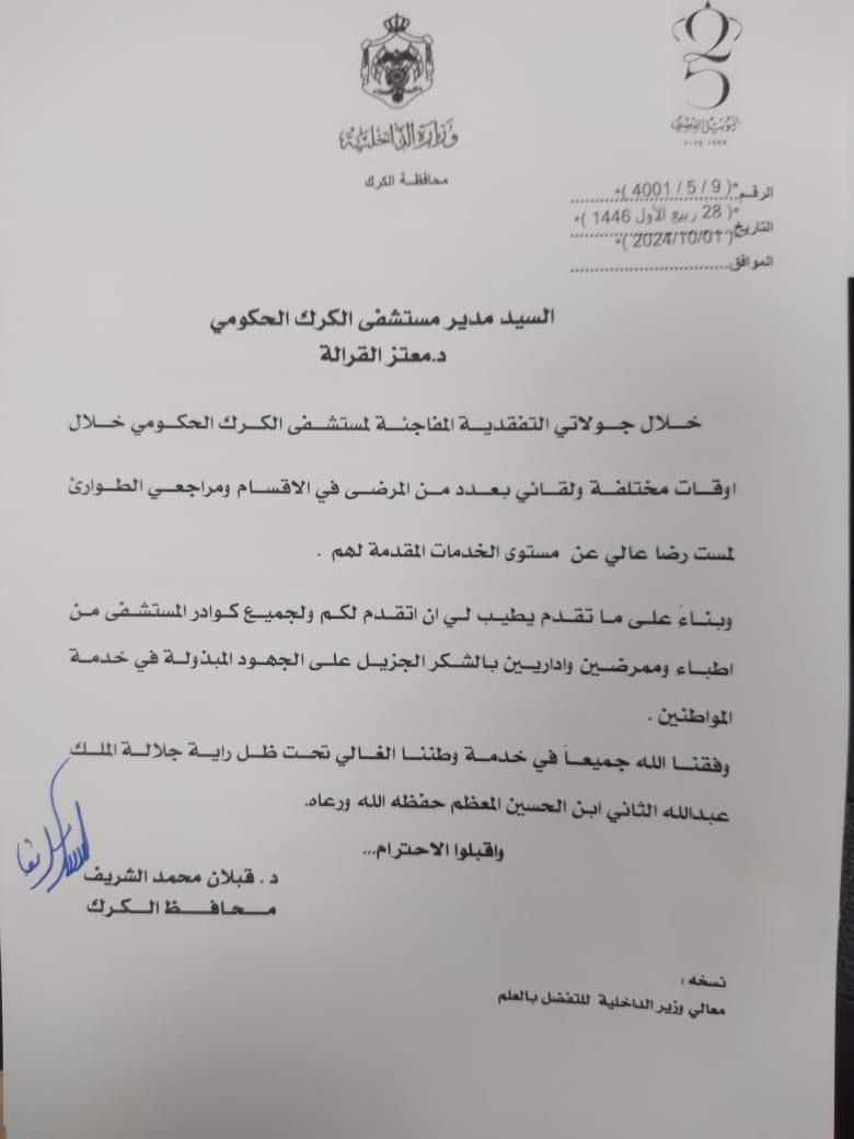 وجه عطوفة د. قبلان الشريف رسالة شكر إلى مدير مستشفى الكرك، الحكومي وكوادر المستشفى لما لمسه من رضى من قبل المواطنين بالنسبة للخدمات المقدمة لهم خلال جولاته التفقدية المفاجئة ولأكثر من مرة للمستشفى